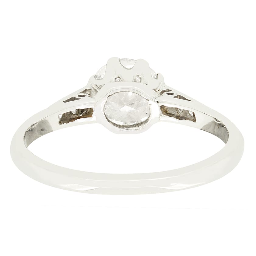 This timeless solitaire ring dates back to the 1920s and features a beautiful old cut diamond at its centre. Weighing 1.05 carat the diamond is of good quality, with a colour of I and a clarity of VS2. The diamond has been delicately claw set into an open 18 carat white gold collet, allowing maximum light into the stone. An additional three eight diamonds adorn each of the ring’s shoulders, totalling 0.18 carat adding finesse to this stunning ring.