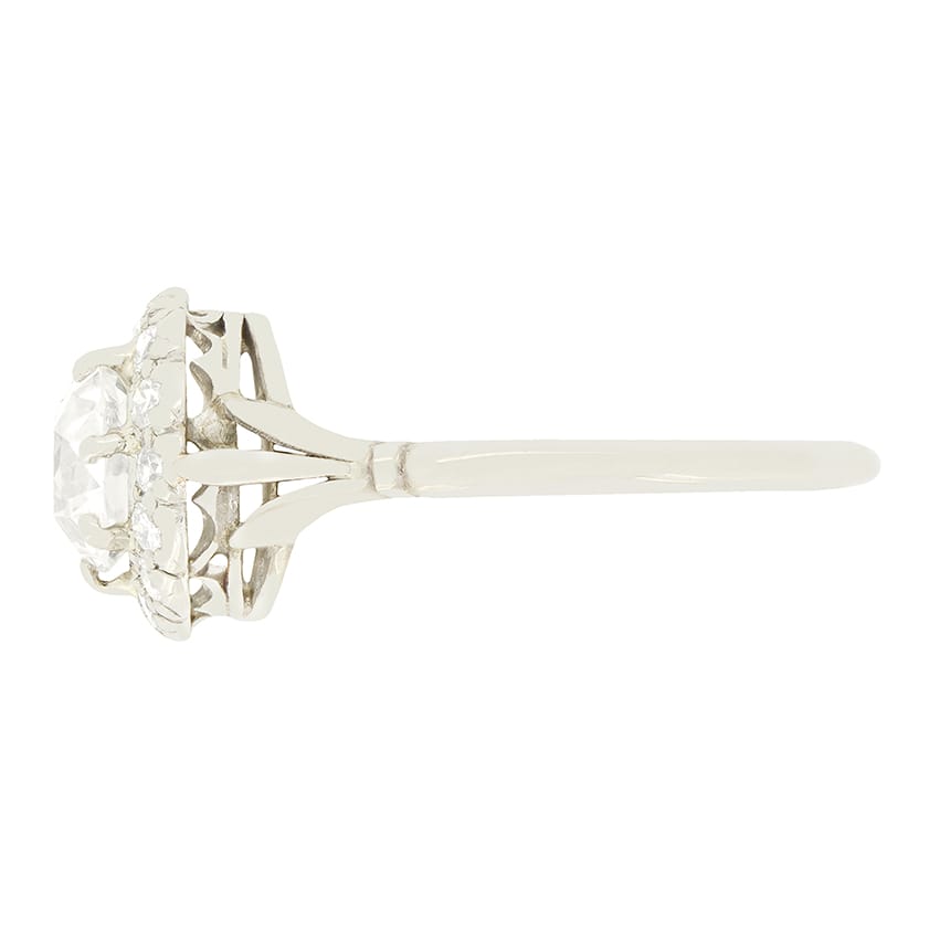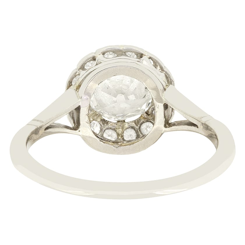 Central to this wondrous Art Deco cluster ring sits a glittering 1.20 carat old cut diamond. Encircling the centre stone, a further 0.42 carat in old cut diamonds are claw set. The diamonds all match perfectly in quality at G in colour and VS1 in clarity. Each diamond is delicately set into platinum, whilst the delightful split shoulder band is crafted in 18 carat white gold.