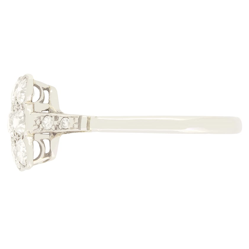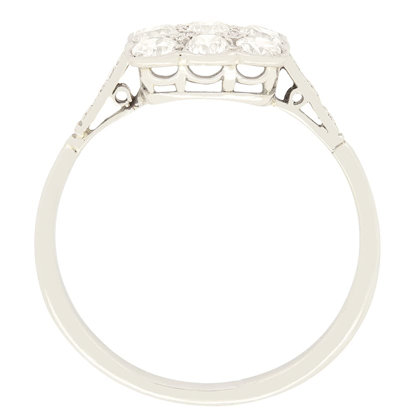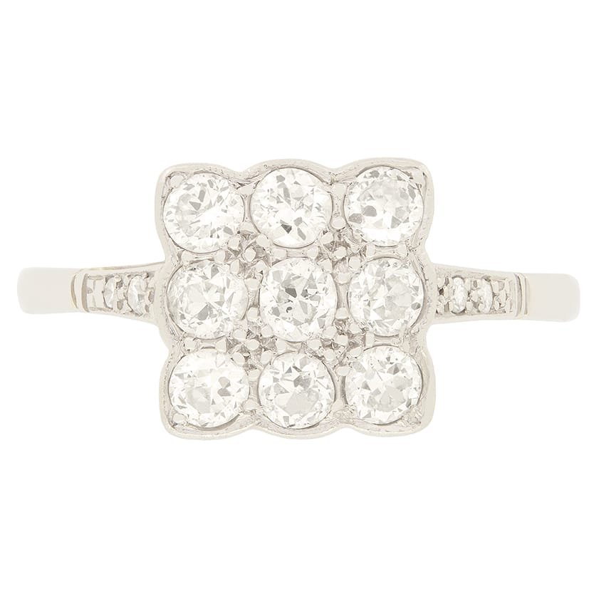 Dating back to the Art Deco period, is this wonderful Art Deco tablet ring. Across the platinum head, nine 0.15 carat diamonds are set in a square cluster. The old cut diamonds are of good quality with colour of G and clarity of SI. Adorning each shoulder an additional two diamonds are sat adding that little extra sparkle. This delightful ring has been entirely crafted by hand in platinum for that beautiful bright white look.