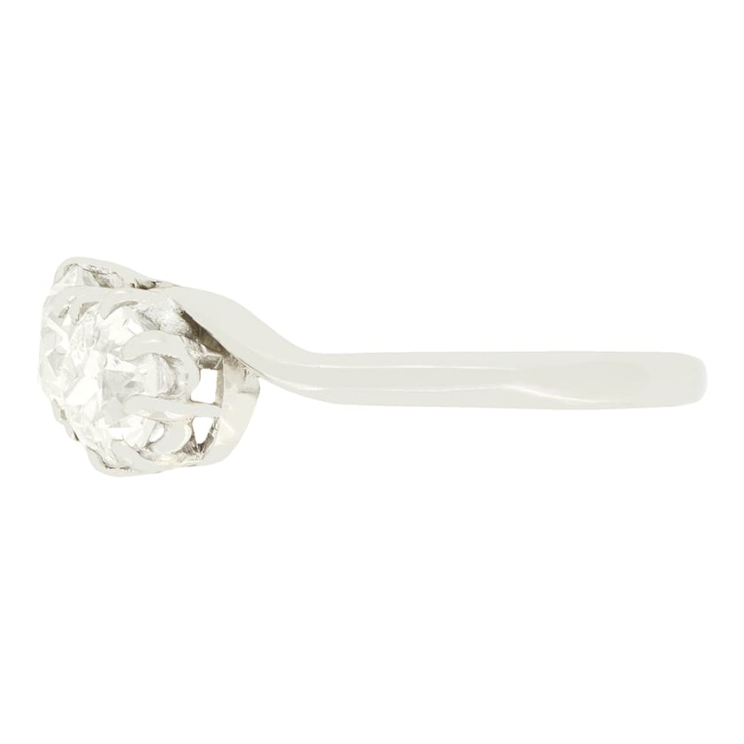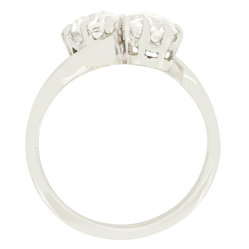 A pair of sparkling old cut diamonds take centre stage in this two stone twist ring from the Art Deco era. Each diamond weighs 0.70 carat and is claw set into a refined platinum collet. The pair match in quality at H in colour and SI1 in clarity. The twisting band elegantly embraces each diamond before flowing around the finger in simple elegance.