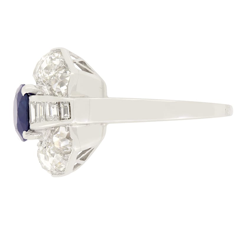 This captivating Art Deco cluster ring exudes the style of the age. At its heart, a vibrant 1.60 carat sapphire sits. The oval cut sapphire is completely natural unheated and is claw set within platinum showcasing its exceptional beauty. Surrounding the sapphire, a glittering arrangement of diamonds contrast the central stone.. Above and below, five old cut diamonds are set. The central of these diamonds are the largest at 0.25 carat, flanked by two 0.20 carat stones with two 0.15 carat diamonds on either end, totalling 1.90 carats across both rows. Completing the design, 0.24 carats of baguette cut diamonds are set on either side of the sapphire, bringing the total diamond weight to 2.14 carat. Expertly hand crafted in platinum this 1920s piece is a true beauty.