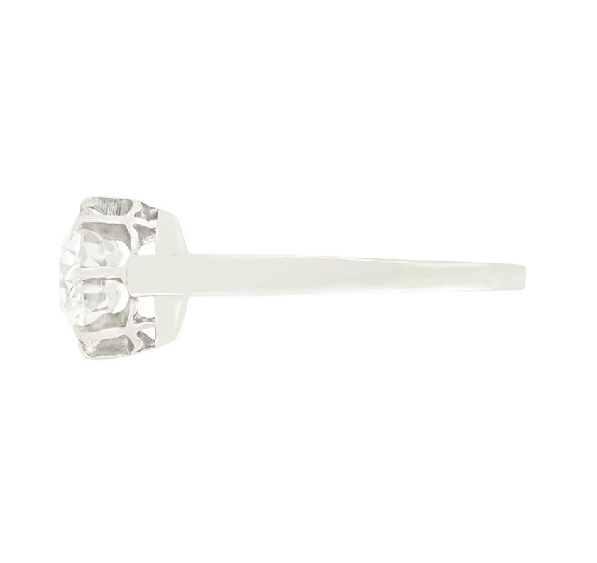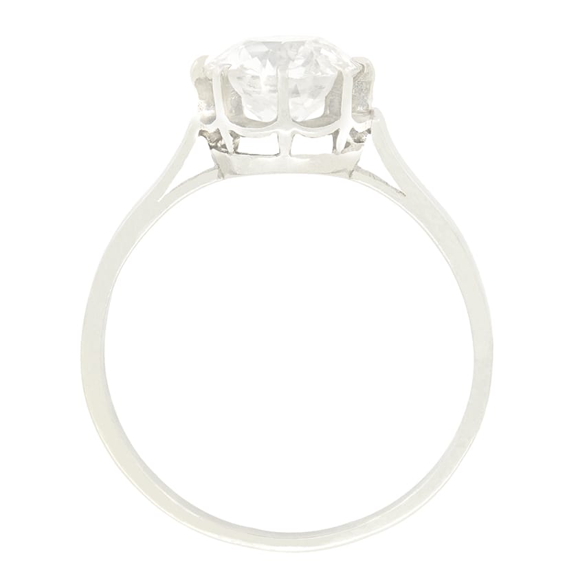 Centring around a beautiful 1.75 carat old cut diamond, this classic solitaire dates to the 1920s. The diamond has a colour of H and clarity of SI2 and is claw set into a platinum collet. True to the fashions of the Art Deco era, the collet then sits upon a band of the same metal for a clean and elegant look.