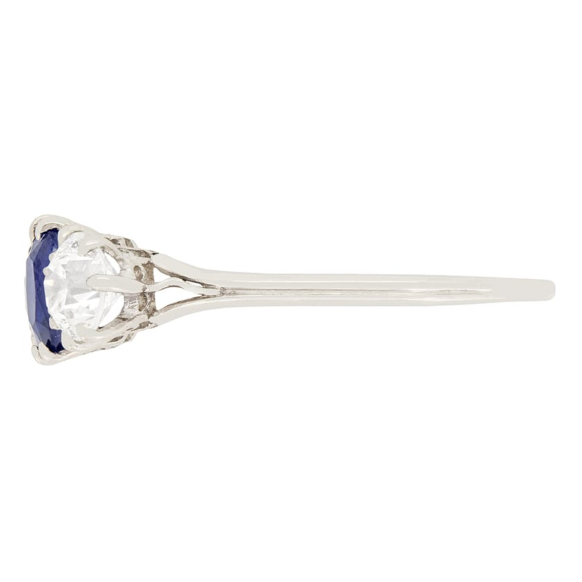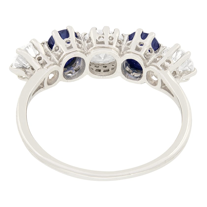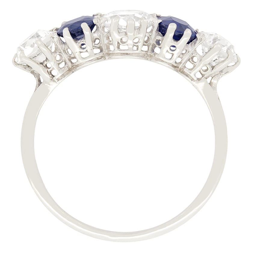 Three transitional cut diamonds glisten in-between two vivid blue sapphires. To the centre sits the largest of the three diamonds weighing 0.80 carat and then to either ends are the smaller ones weighing 0.50 carat each. The oval shaped sapphires that alternate between the diamonds, are natural and weigh 0.60 carat each. This gorgeous ring has been crafted entirely in platinum and dates back to the 1920s.