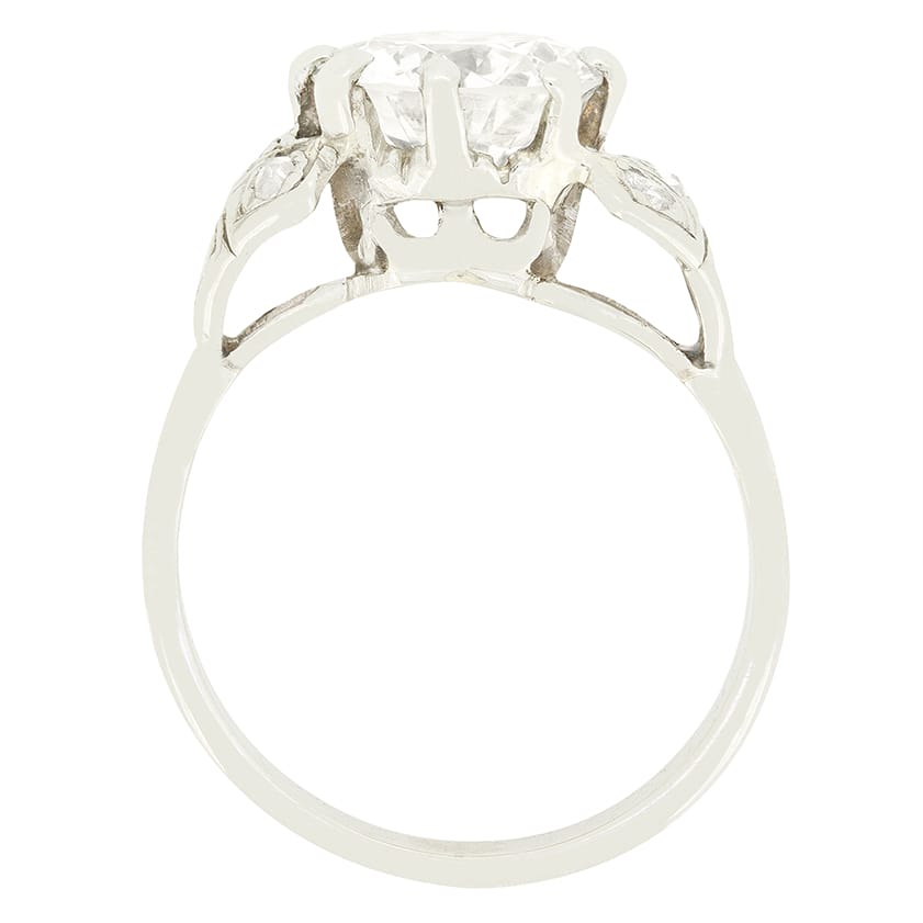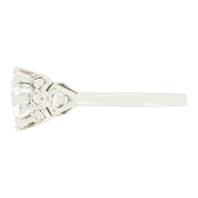 This beautiful solitaire design was hand crafted in the 1920s. The Art Deco piece showcases a sparkling 1.85 carat transitional cut diamond at it’s centre. The diamond has been given a colour of I and a clarity of VS1. The diamond has been claw set into a high and open collet, allowing light underneath so the diamond looks it’s absolute best. Tapered shoulders feature an additional four rose cut diamonds each, adding a little extra finesse to an already beautiful piece. Crafted by hand in platinum this is a unique take on the classic solitaire design.