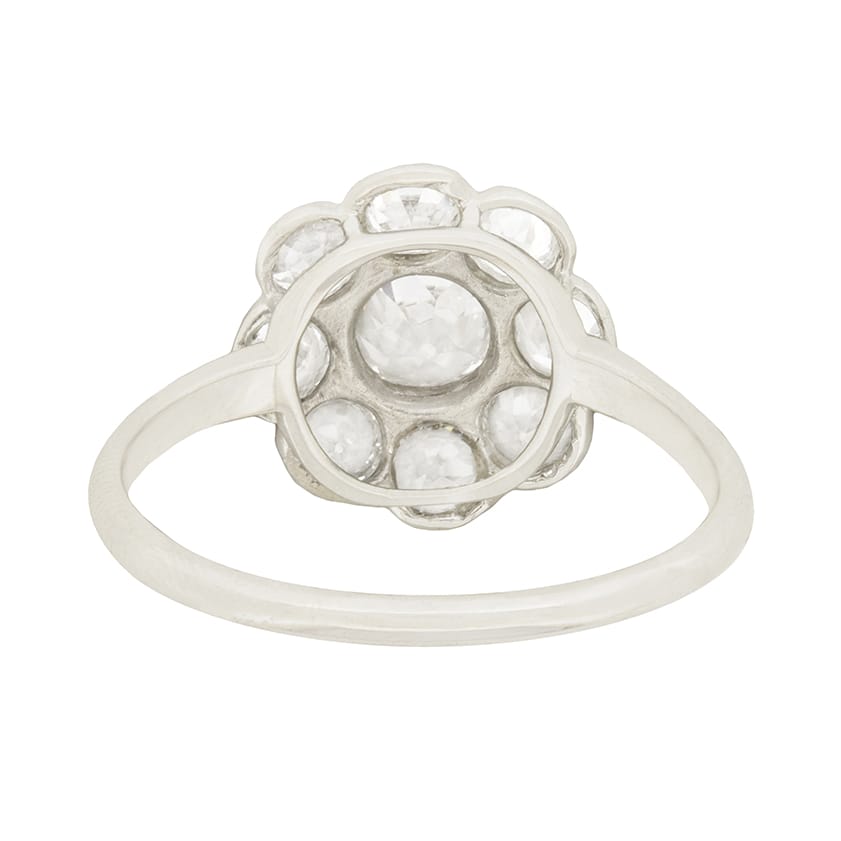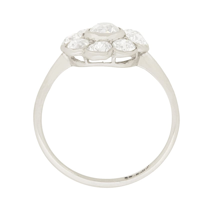 This sweet art deco ring features nine diamonds in a daisy motif. The diamonds are G-H in colour and VS clarity, and total to 2.10 carat. The centre old cut diamond is 0.50 carat, while the surrounding eight-cut diamonds are 0.20 carat each. Each diamond is rub-over set in 18 carat white gold.