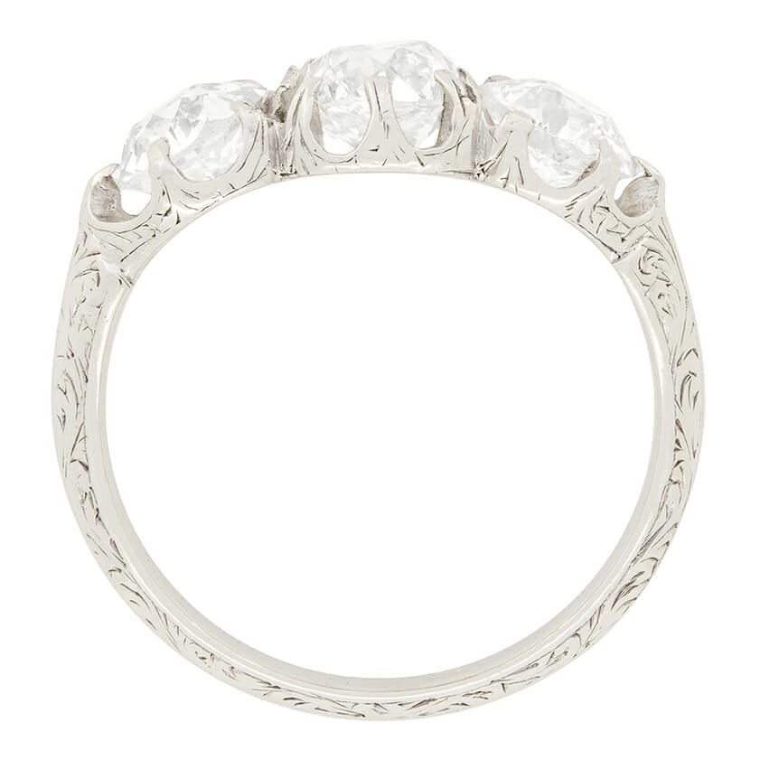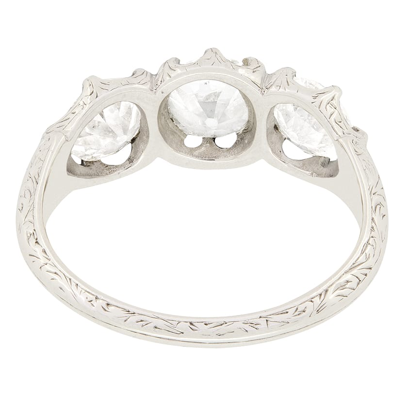 Three superb old cut diamonds are beautifully presented in this splendid trilogy engagement ring. In the centre sits the largest of the trio weighing 0.80 carats and on either end are slightly smaller diamonds weighing 0.65 carats each. All three old cuts are of excellent quality, being estimated as F-G in colour and VS in clarity. Delicate hand carved patterns run along the entire platinum band, adding that Art Deco charm.