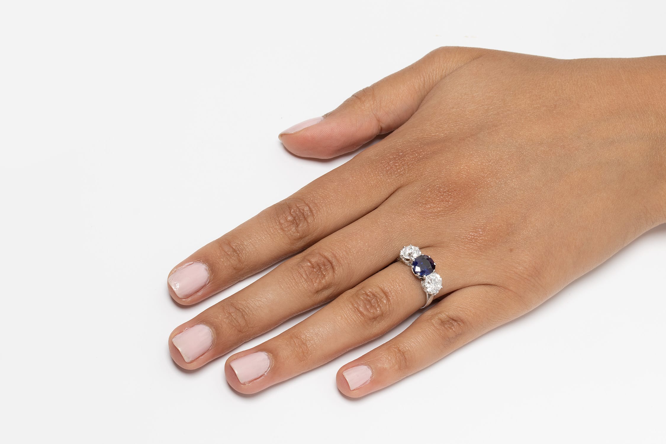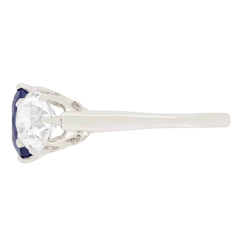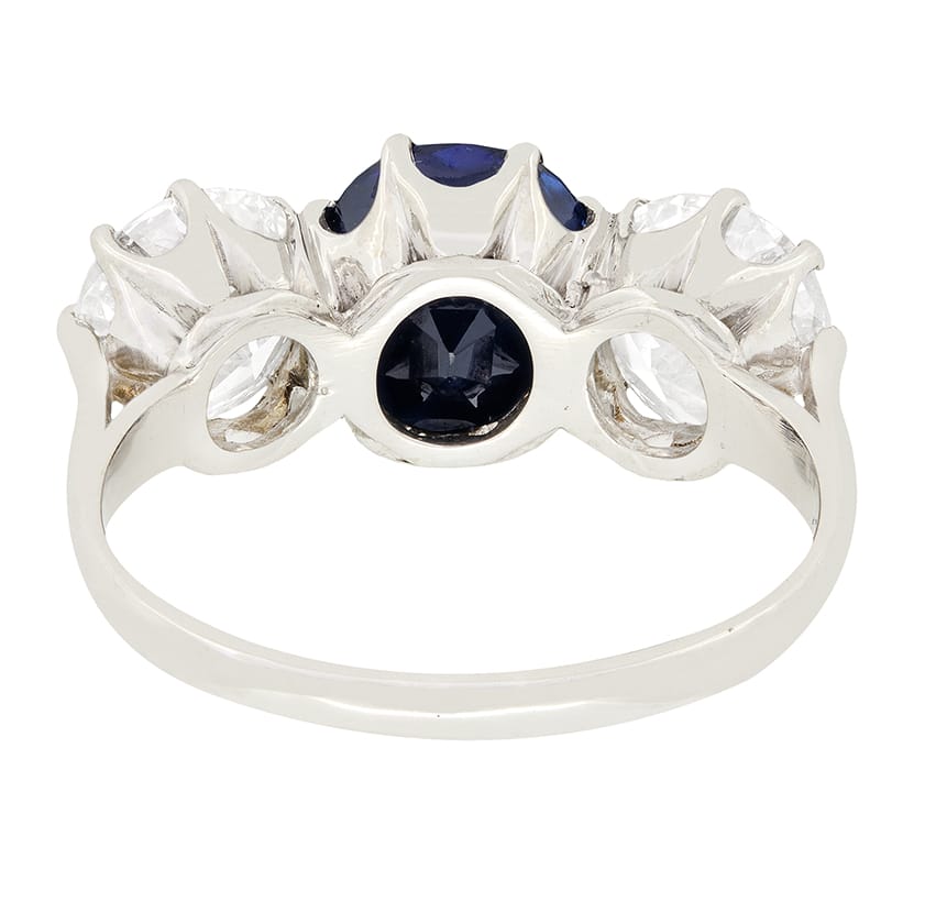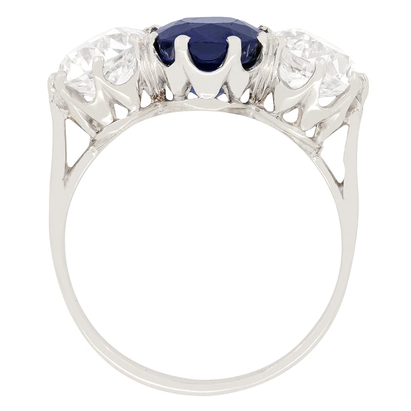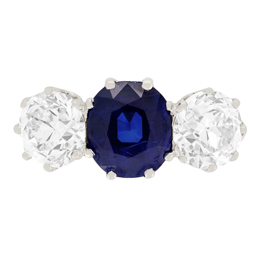 A sought after unheated Burmese sapphire sits between two sensational diamonds. The 2.25 carat sapphire has such a vibrant colour which compliments the quality of the diamonds. The old cut diamonds weigh 1.15 carat each and have been graded as E-F in colour and VS in clarity. All three stones have been claw set into a gorgeous hand made platinum mount, perfectly showing off their natural beauty. This stunning ring dates back to the 1920’s and comes with an EDR certificate.