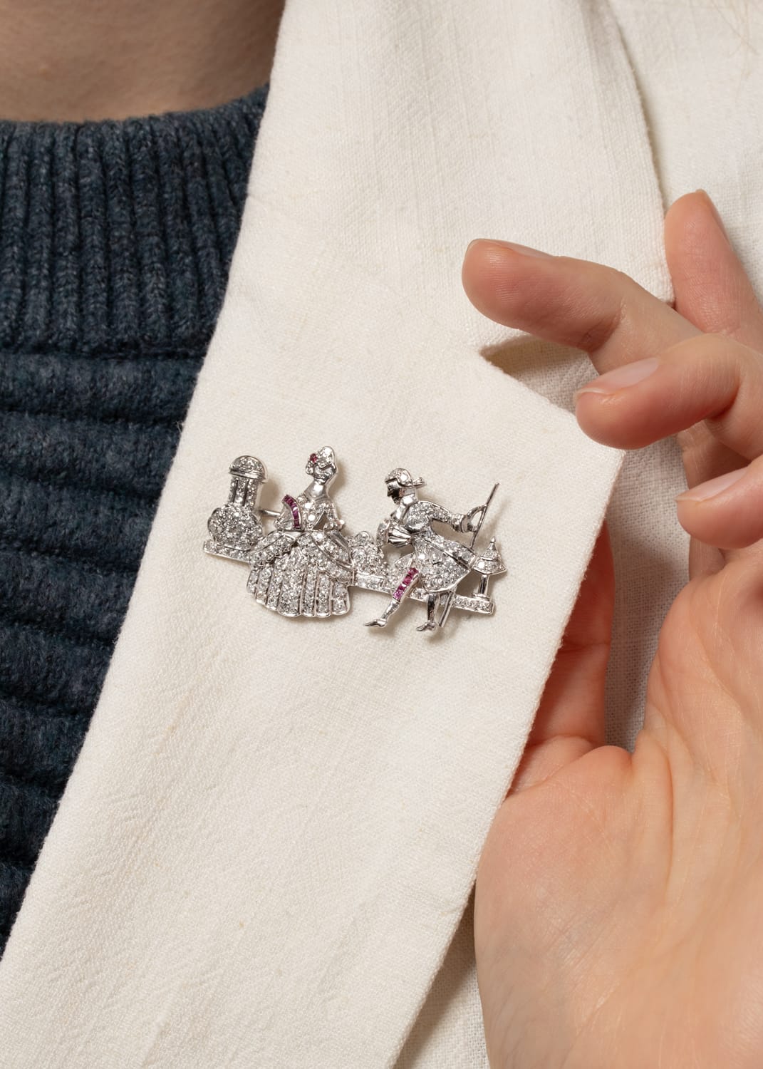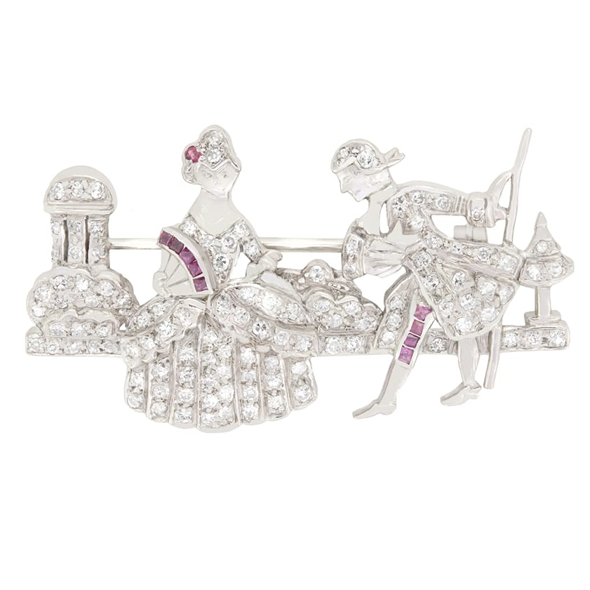 Truly one of a kind, this intricate brooch depicts a courtly seen of a lady fanning herself, whilst a lord bows deeply to her. Crafted in the Art Deco period the piece features a total of 113 diamonds of varying sizes with a carat weight of 2.50. The diamonds all match in quality at G in colour and VS in clarity. Accenting the details of the scene, baguette cut rubies can be found across the fan, in the hair piece of the lady, and down the leg of the lord. These rubies total 0.20 carat and enhance the intricately crafted piece wonderfully. Entirely crafted by hand in platinum this brooch is a masterful creation.