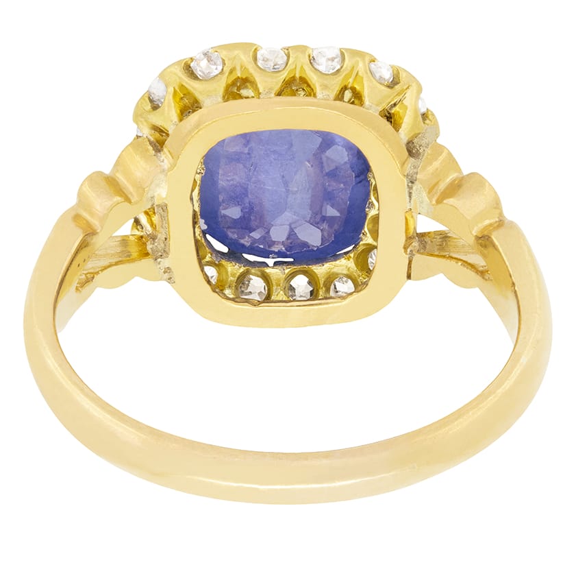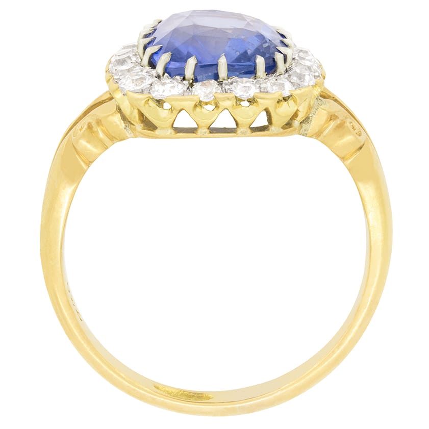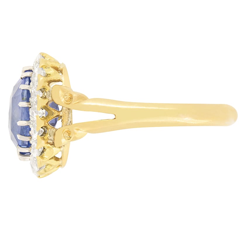 A stunning Natural Sri Lankan Sapphire is central to this Art Deco coronet cluster ring. The cushion cut sapphire is a wonderful cornflower blue in colour and weighs 4.54 carat. Claw set into platinum and surrounded by a halo of old cut diamonds. A total of eighteen diamonds with a total weight of 0.90 carat. These diamonds all match in colour being graded G and range in clarity from VS to SI. Beautifully carved split shoulders elegantly flow down from the head of the ring into the band crafted from 18 carat yellow gold.