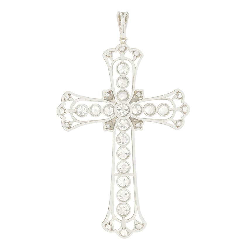 This beautiful cross pendant dates to the Art Deco period. Hand crafted in platinum the cross is adorned with a total of 5.40 carat in old cut diamonds. At its centre sits the largest stone at 0.40 carat with graduating diamonds sitting above and to the right and left. These graduating stones sit at 0.20, 0.25 and 0.30 carat respectively. Below the centre stone seven matching 0.30 carat stones complete the central diamond cross. Additional decorative diamonds totalling 0.65 carat are set surrounding the central cross and across the bail. Each diamond used is of good quality ranging in colour from G to H and in clarity from VS to SI.