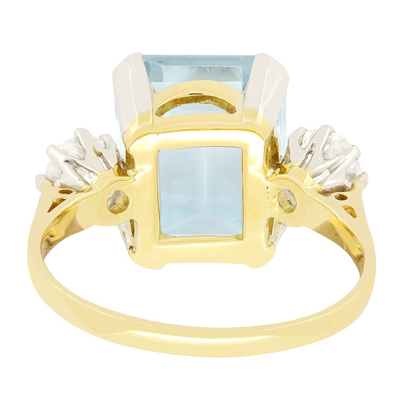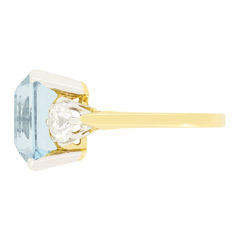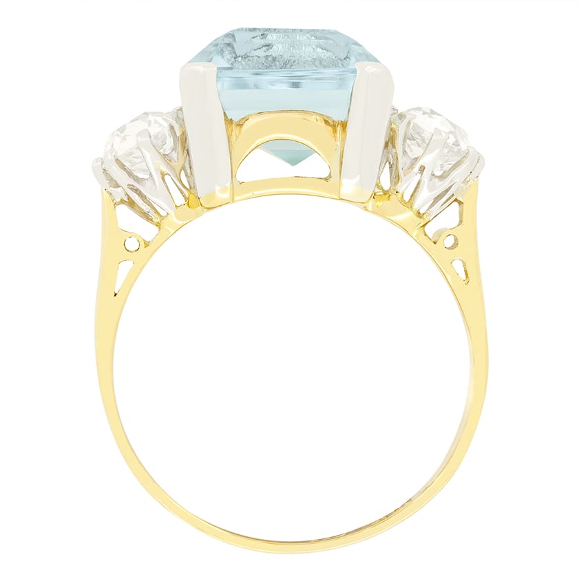 This stunning 1920s trilogy ring showcases a captivating emerald cut aquamarine at its centre. The expertly claw set aquamarine weighs 5.50 carat and is flanked by two 0.50 carat old cut diamonds, each matching in quality at H in colour and VS2 in clarity. The dazzling trio are set into platinum, which seamlessly connects to the contrasting band of 18 carat yellow gold.