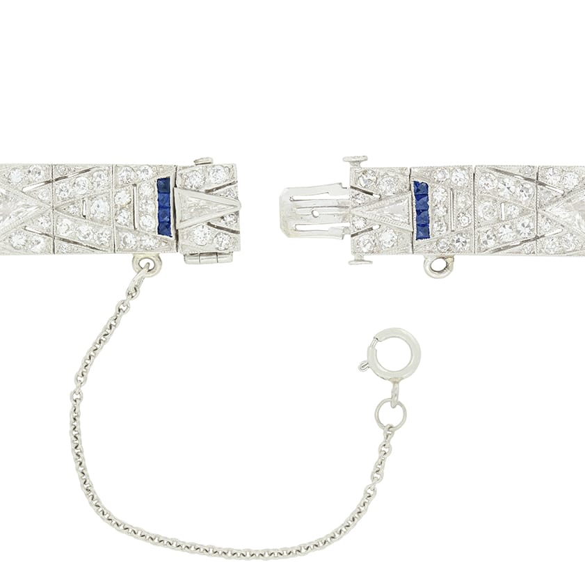 Enchanting in its design, this stunning bracelet dates to the 1920s. The Art Deco design is clear to see with the use of geometric and symmetrical patterning created from contrasting diamonds and sapphires. The design centres around trillion cut diamonds totalling 2.70 carat, accented by lines of French cut sapphires totalling 0.76 carat. Adorning the surrounding design a further total of 5.50 carat of both old cut and eight cut diamonds are set into platinum. The diamonds used are all of good quality, ranging in colour from F to G and matching in clarity at VS2. This expertly hand crafted bracelet sits beautifully upon the wrist at 16cm in length.