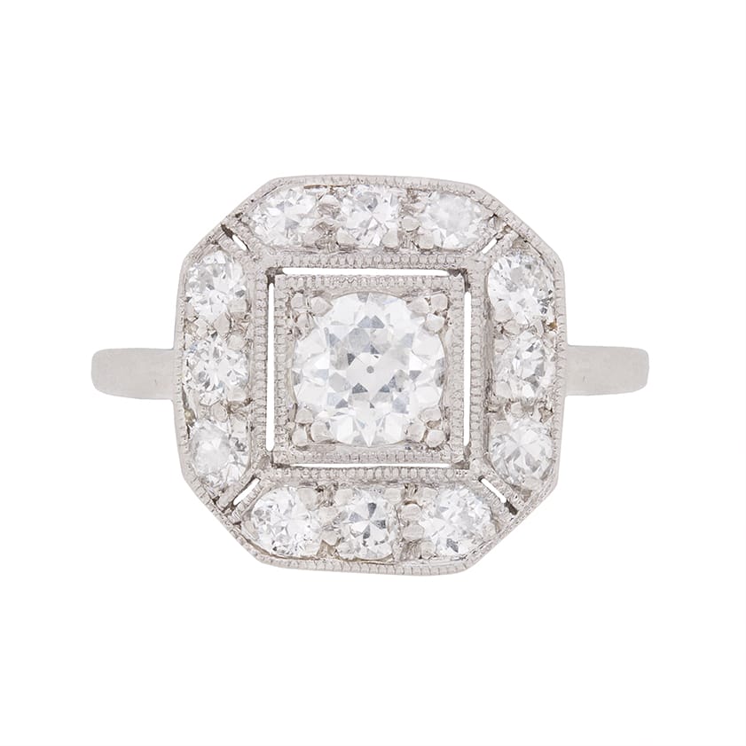 Dating to the 1920s, this art deco ring features a diamond in the centre weighing 0.50 carat. It has been graded as G in colour and VS1 in clarity, and is it beautifully grain set. The surrounding cluster of the ring is in a highly desirable geometric pattern. The total weight is 0.60 carat and the dazzling diamonds match the centre stone for quality. They are also grain set, showing the high level of craftsmanship. The ring is typically worn as a dress ring and is made from platinum.