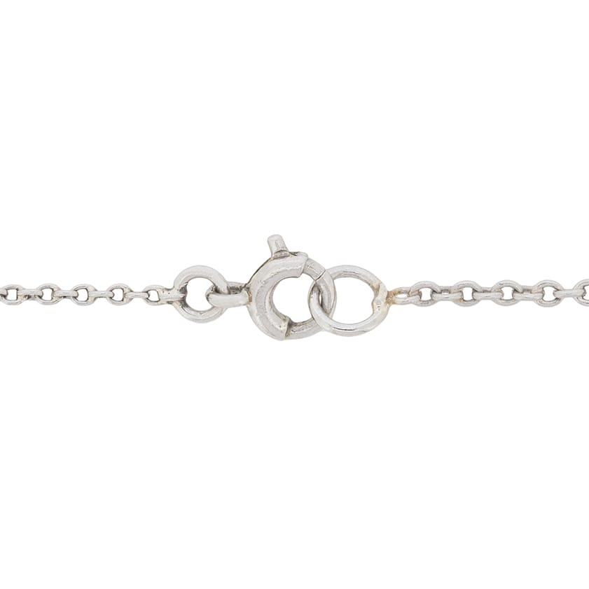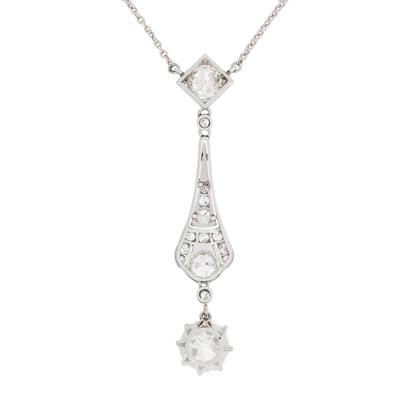 Made all in platinum and dating to the 1920s, this is a stunning diamond necklace. At the bottom of the drop sits a 1.78 carat diamond within a claw collet. It is a beautiful old cut diamond and has been estimated as a J in colour and VS1 in clarity. In the centre of the necklace, within the art deco detailing of metal work, there are a cluster of diamonds weighing 0.75 carat in total. Reaching the top of the necklace, there is another single old cut diamond weighing 0.55 carat. The surrounding diamonds match the main diamond for colour quality and range in clarity from VS to SI in clarity. They are intricately set and the piece is finished with a mill-grain edge. It hangs from two points on a platinum chain with a bolt ring clasp.