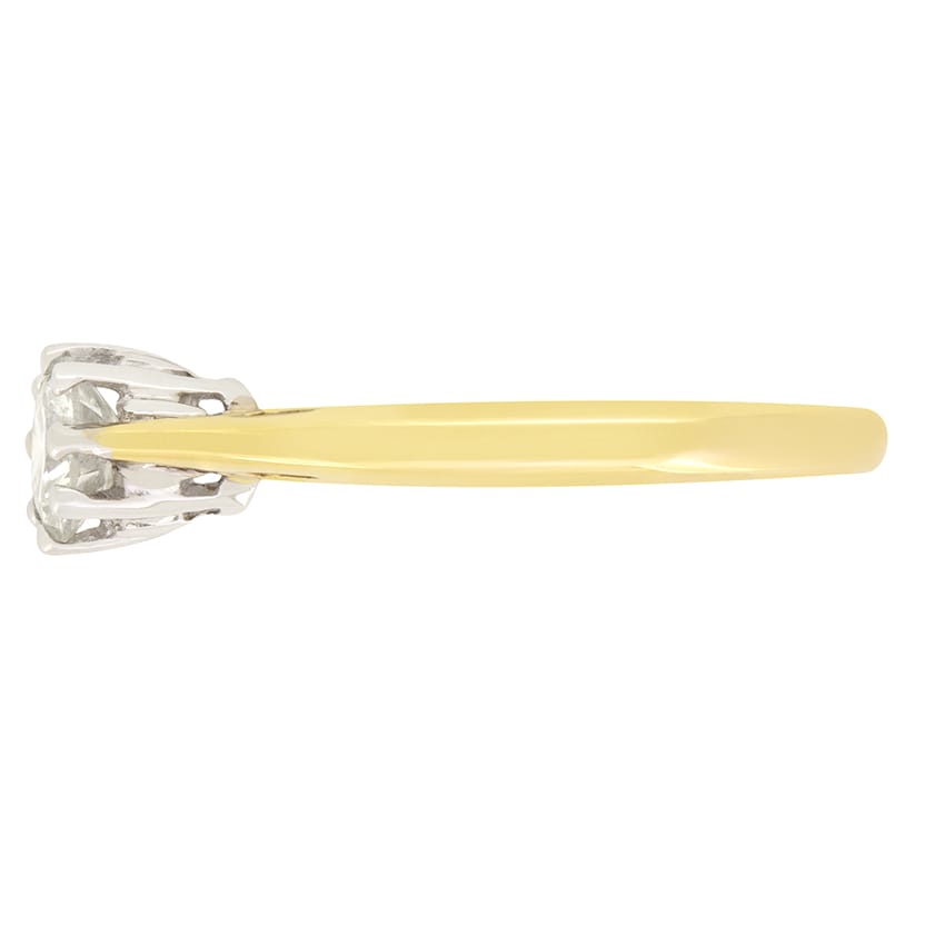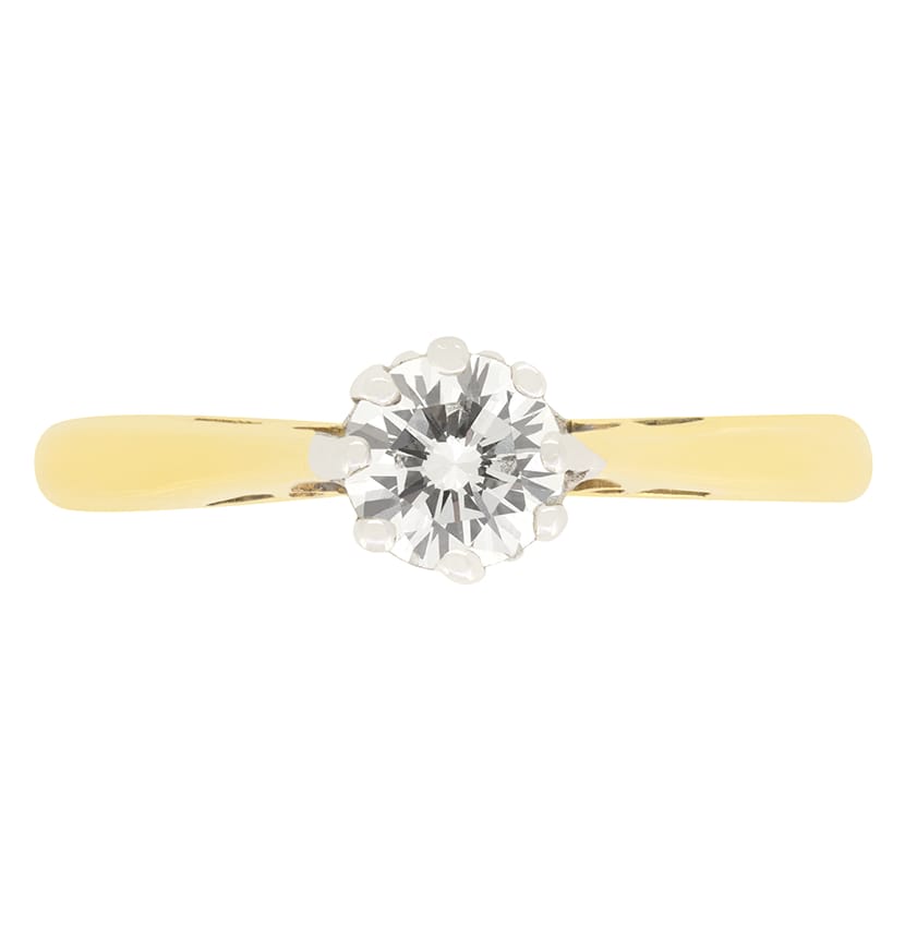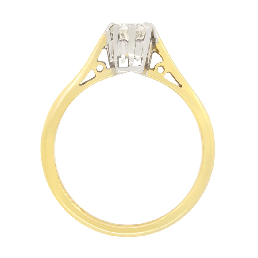 This delicate and elegant solitaire centres around a glittering round brilliant diamond. It is 0.45 carat, with a colour estimate of I and clarity VS. Set within an 18 carat white gold collet, the stone is proudly presented with high shoulders, typical of this era. The band is crated in 18 carat yellow gold to create a timeless two tone look.