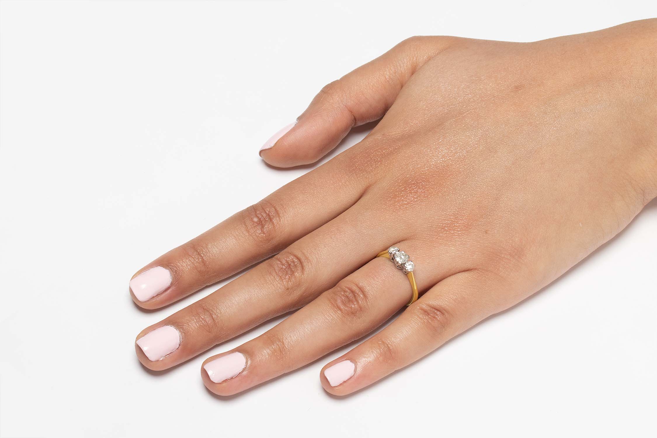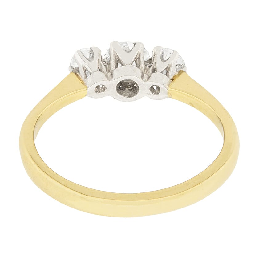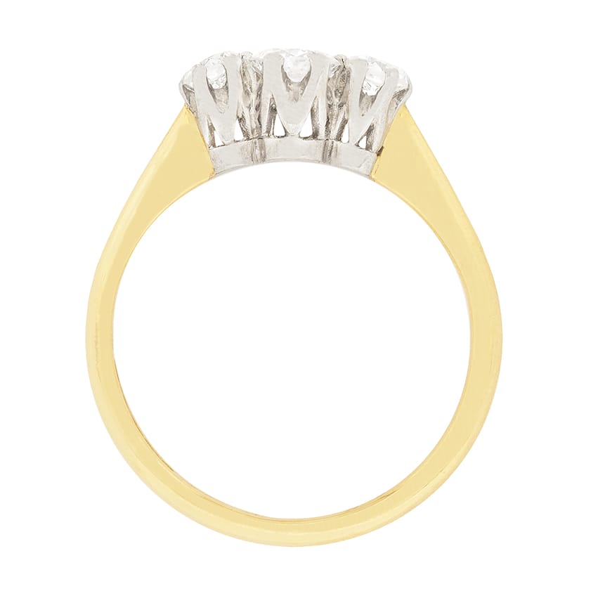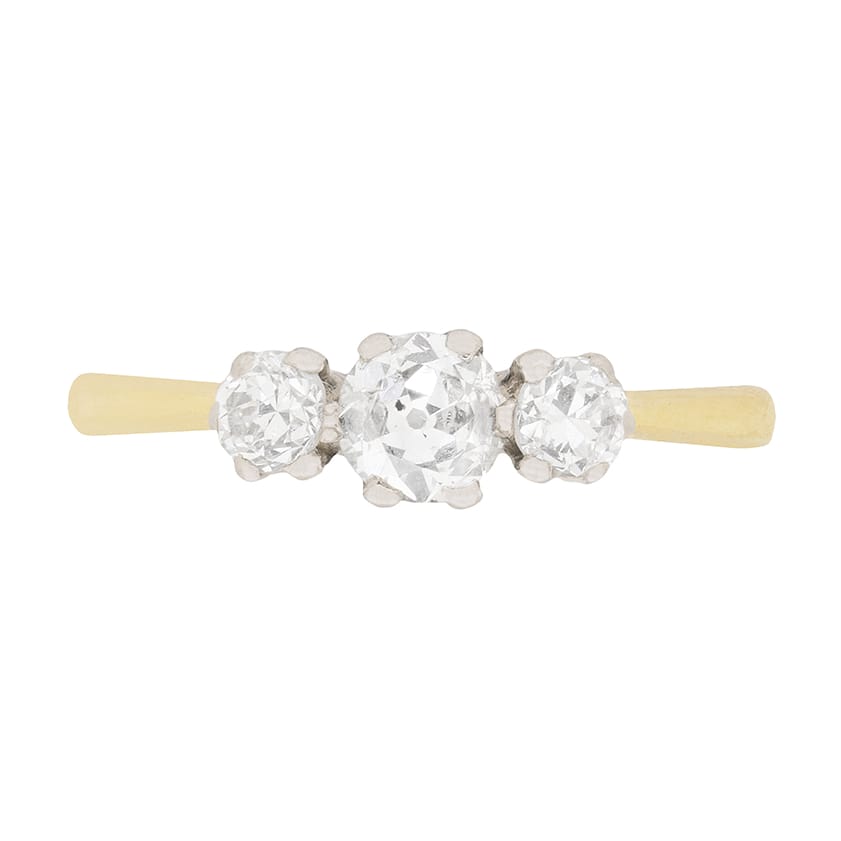 This three stone ring is a collection of old cut diamonds, the centre weighs 0.40 carat and the two adjacent weigh 0.20 carat each. All the diamonds match in quality, estimated as H in colour and SI in clarity. The setting work has been made from platinum, whilst the shoulders and shank are in 18 carat yellow gold. The ring dates to approximately the 1930s.