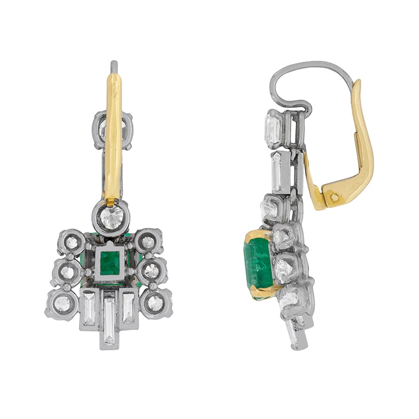 These beautifully crafted earrings feature Emeralds as the main gemstones and they have a combined weight of 4.00 carat. We have also had them certified as natural Emeralds which have moderate clarity enhancement. They are Colombian and have been expertly set within an 18 carat yellow gold collet. Each stone is then wonderfully highlighted by a cluster of diamonds which vary in shape and size. At the top of the drop, there is a 0.40 carat Assucher cut diamond. Within the cluster there is a mix of baguette diamonds, totalling 0.50 carat and round brilliant diamonds, totalling 0.85 carat. Each earring is able to boast a carat weight of 1.75 carat and the diamonds are of high quality. The diamonds are set within platinum, allowing their colour to truly sparkle. They have secure backs as well, which are a mix of platinum and 18 carat yellow gold.
