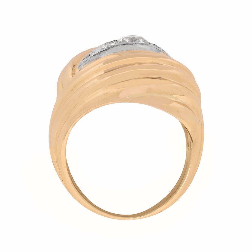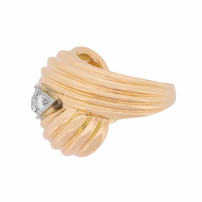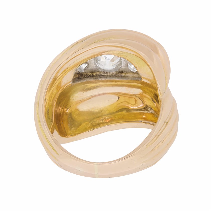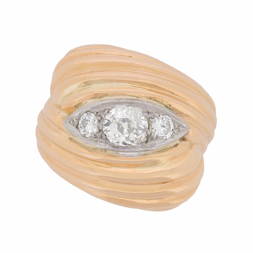 This unusual and unique ring dates back to the 1920s and is french made. It features three old cut diamonds in the centre of the ring, with the centre weighing 0.50 carat and either side weighing 0.10 carat. They are estimated to be G in colour and VS 2 in clarity and are grain set within platinum. The remainder of the ring is fantastically modelled into it’s shape. It is made of 18 carat rose gold and is definitely an eye-catching ring.