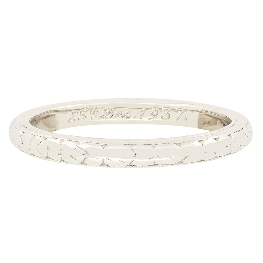 This beautifully carved wedding band was crafted in the Art Deco period. The band is 2mm wide and created from 3.2 grams of platinum. Along the inside of the band the date 25th Dec 1937 has been engraved.