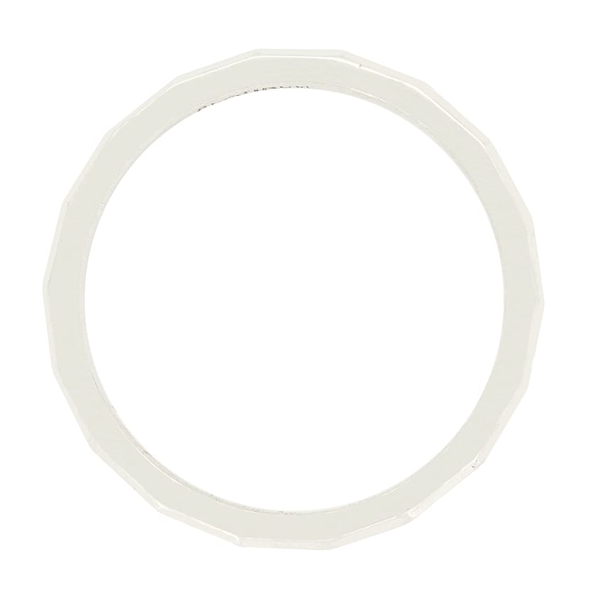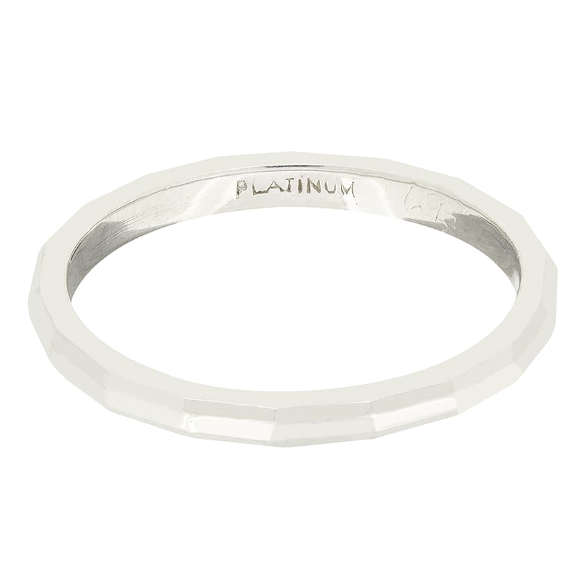 Dating to the Art Deco era, this wedding band features a wonderful angled design. Crafted in platinum the band is 1.9mm in width with a weight of 3 grams.
