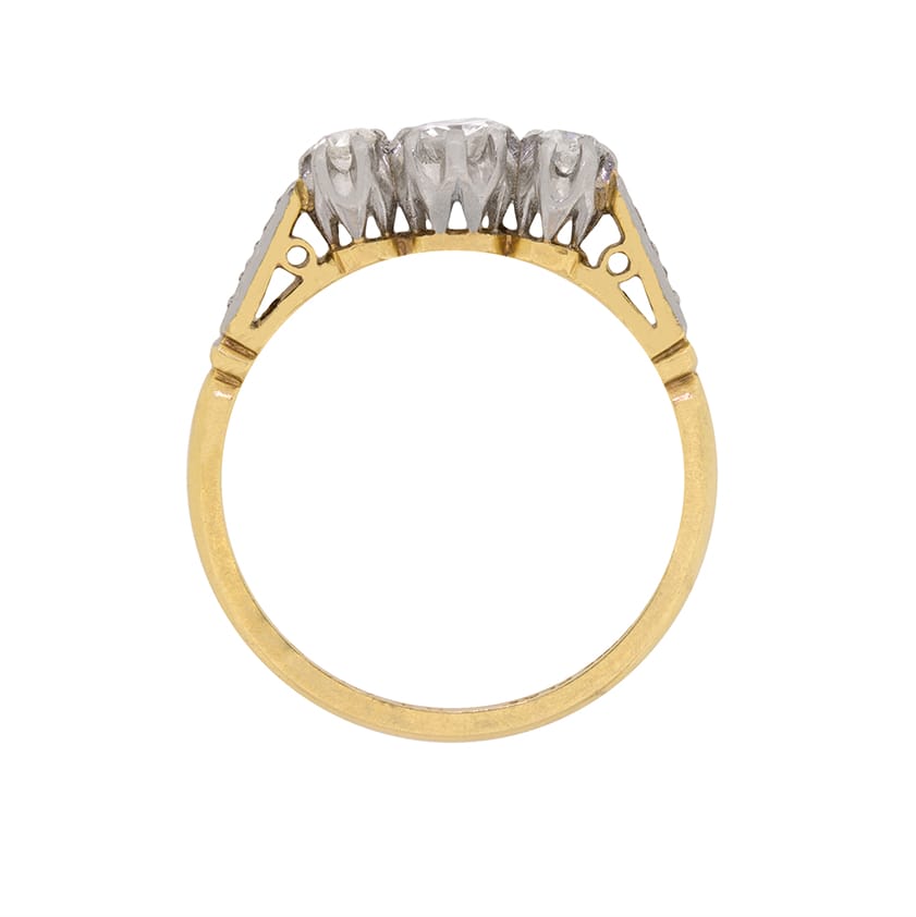 This delicate little ring is a classic three stone dating back to the 1930s. In the centre of the trilogy you have an old cut diamond weighing 0.20 carat, whilst adjacent on either side are transitional cut diamonds, each weighing 0.10 carat. The use of thwo types of hand cut stones is unique, and to add further character, there are diamonds set on the shoulders which have a combined weigh of 0.04 carat. The centre stones are estimated G in colour and SI1 in clarity and are all claw set. The diamonds are set within platinum, which has been hand crafted to make these stunning collets. Leading on from the diamond studded shoulders is the 18 carat yellow gold band.