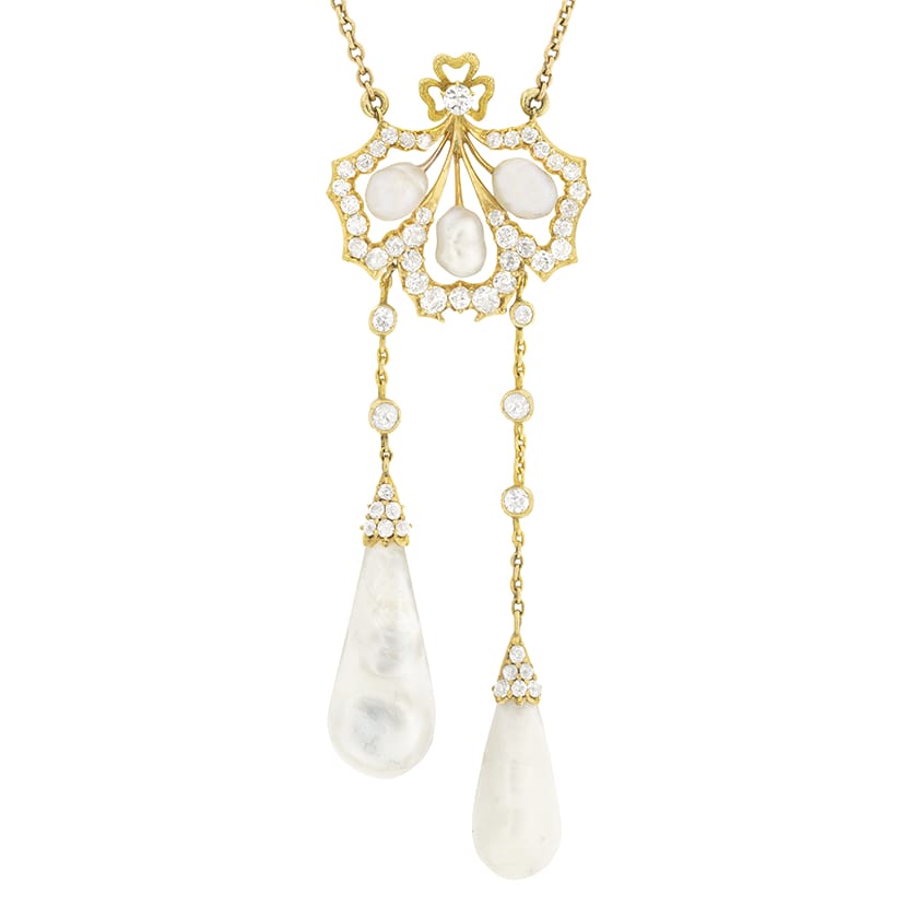 Art Nouveau 2.50ct Diamond and Pearl Drop Necklace, c.1880s