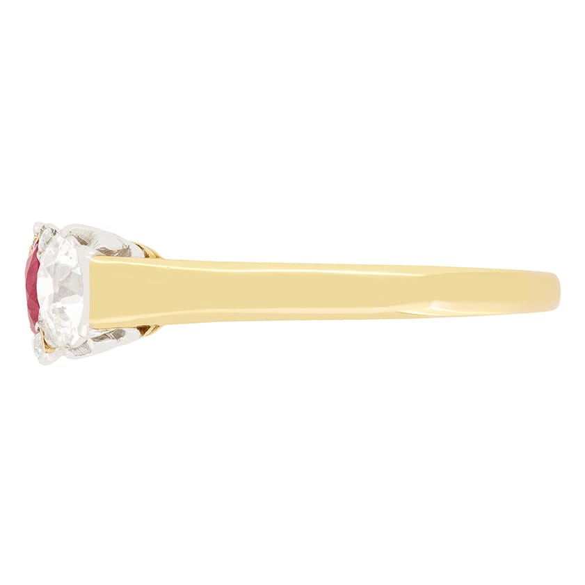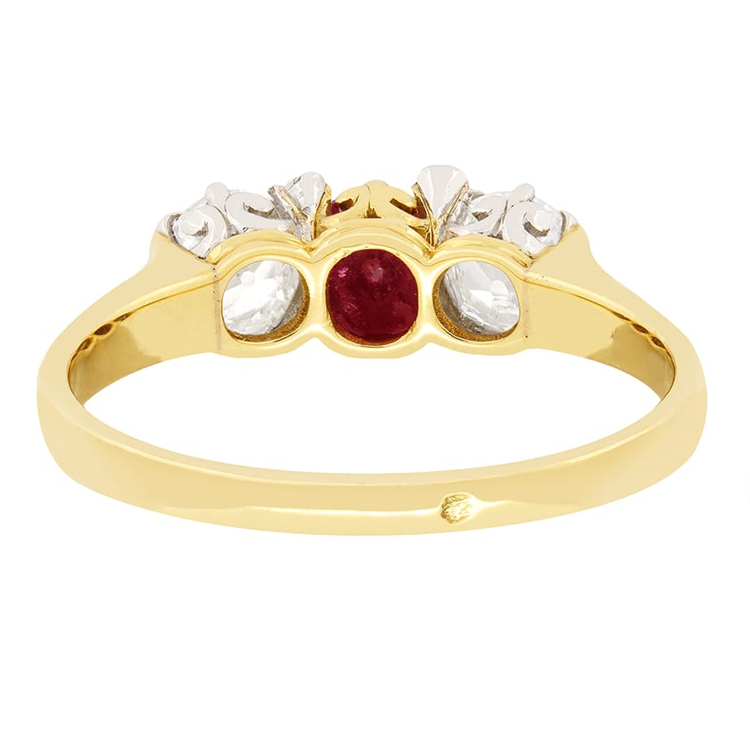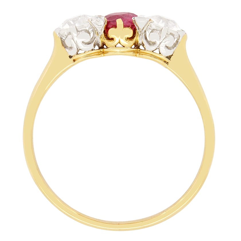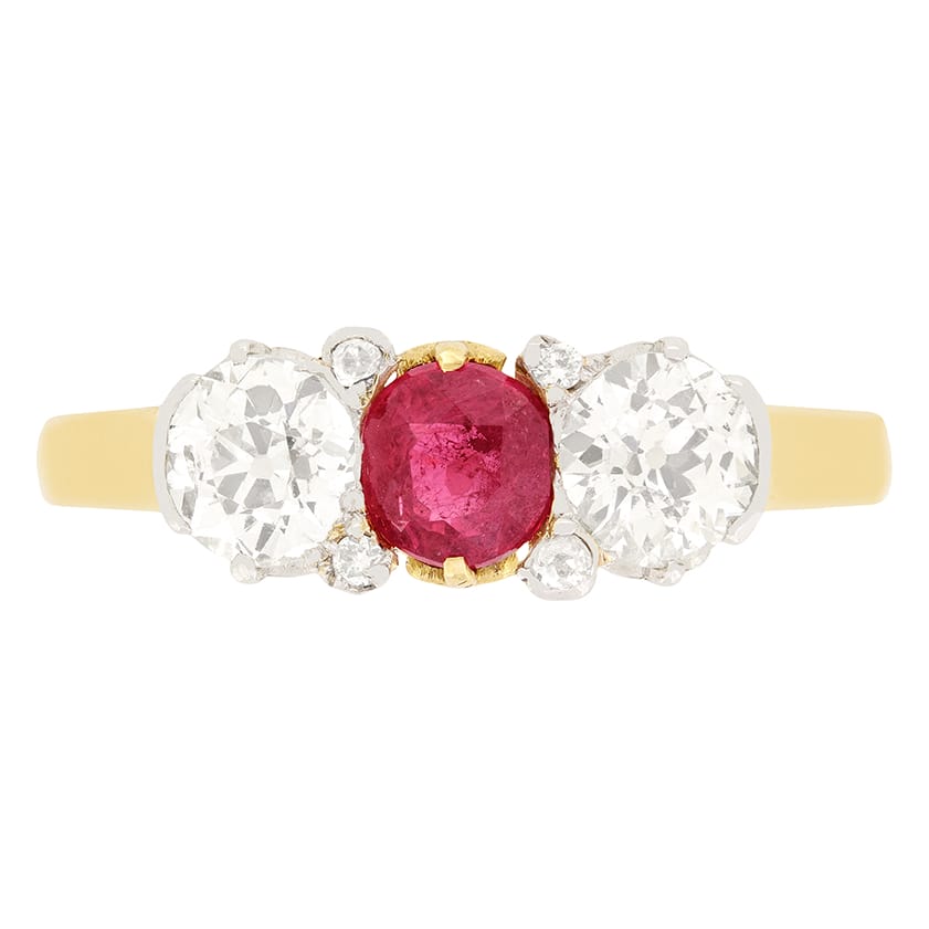 A luscious ruby is flanked by two glittering old cut diamonds in this French trilogy ring. The ruby is an old cut stone weighing 0.40 carat and is set into 18 carat yellow gold. Contrasting the central ruby beautifully, the pair of old cut diamonds have a combined weight of 1.00 carat. The diamonds match in colour at G whilst ranging in clarity from VS to SI. in between the primary trio, an additional four small diamonds have been set, adding a little extra flair to this already stunning piece. Each diamond has been set into platinum, allowing them to look their absolute best. A gently tapering band of 18 carat yellow gold completes the Belle Époque piece.