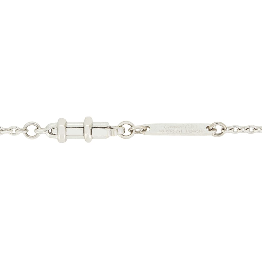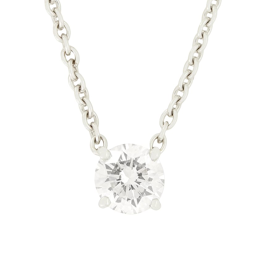 From Cartier comes this timeless single diamond pendant. The diamond weighs 0.84 carat with a colour of G and clarity of VS1. Claw set into 18 carat white gold, this pendant sits upon a 16″ chain, making it perfect for everyday wear. This wonderful piece comes with its original Cartier certification.