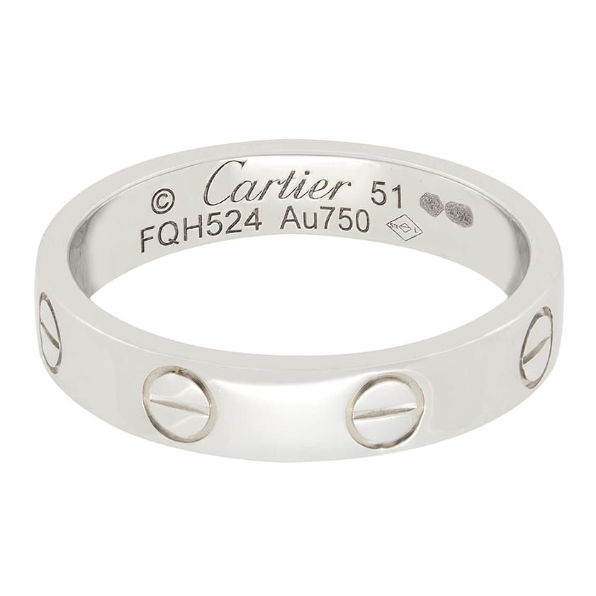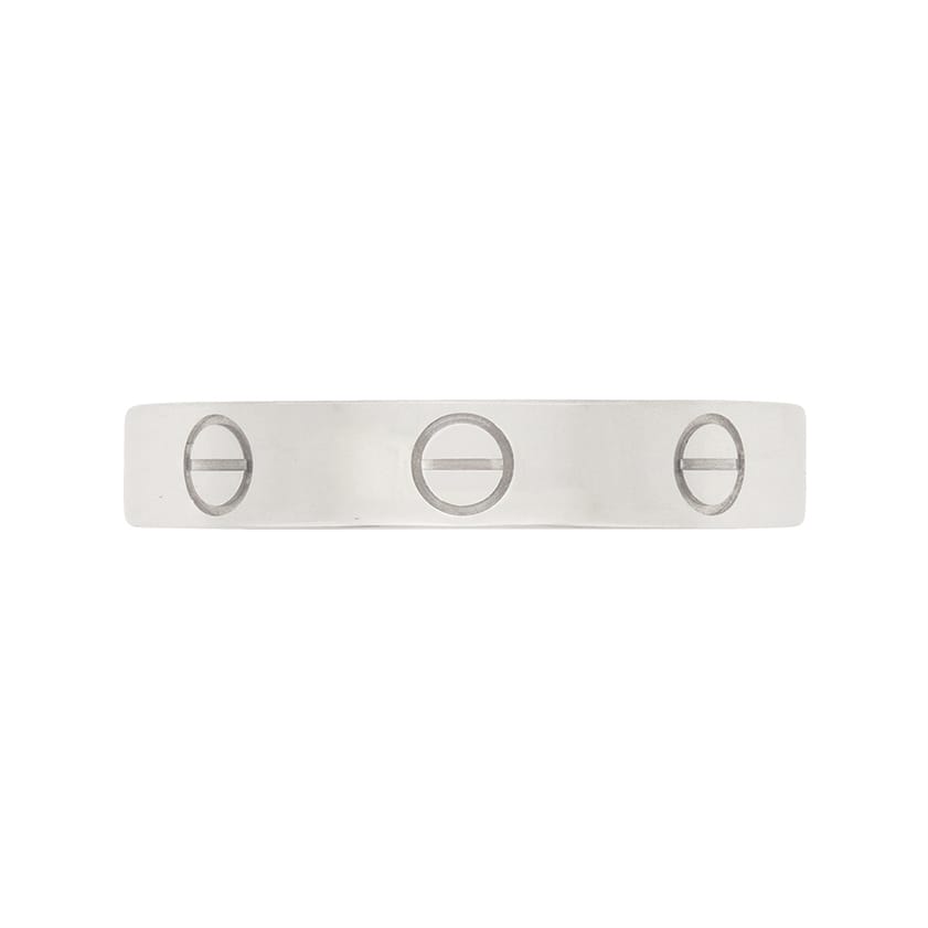 Original from Cartier, with paperwork, this is a classic ring from their LOVE collection. It is made from 18 carat white gold and features the screw pattern all the way around. It has makers marks on the inside of the ring and is a size K and 3.6mm wide.