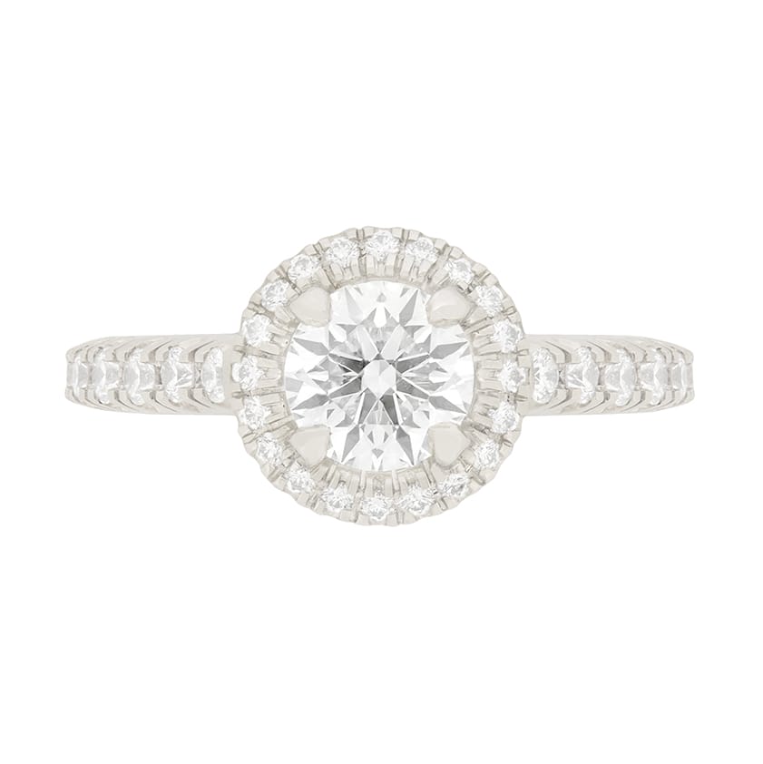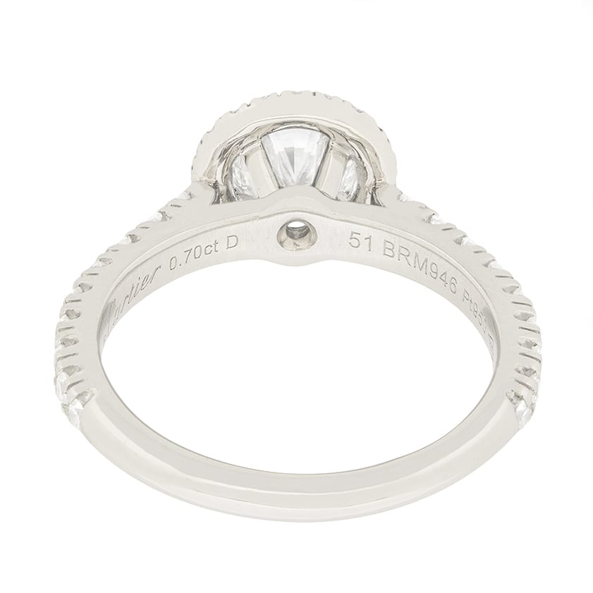 A classic Cartier ‘1895 Destinée’ diamond halo engagement ring. The centre diamond is 0.70 carat, and is certified by GIA as an H colour and VVS2 clarity. It is surrounded by a delicate halo of round brilliant diamonds totalling to 0.38 carat. The setting is made of platinum and has all original Cartier hallmarks.