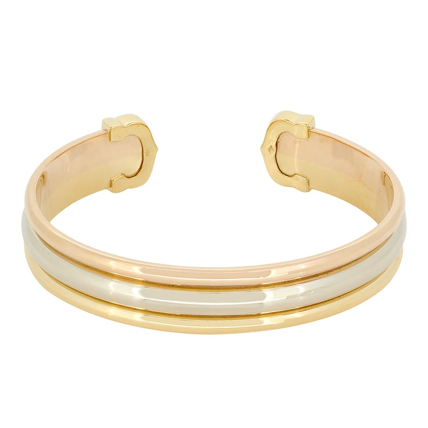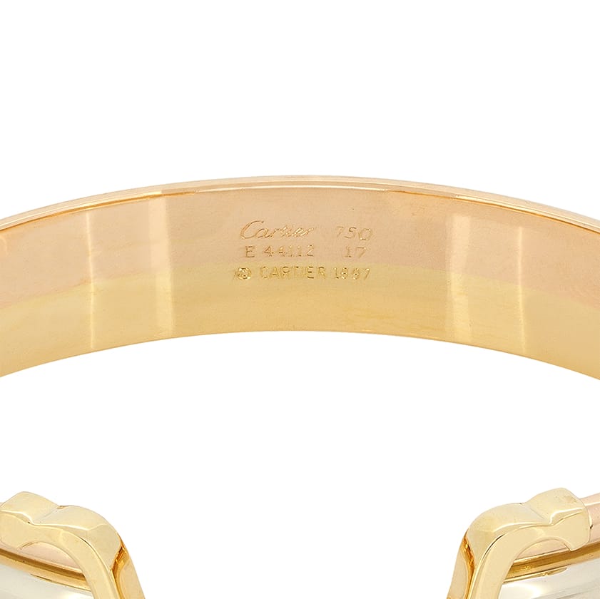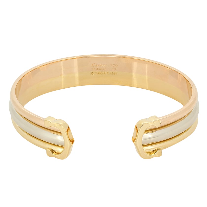 From the designer Cartier comes this wonderful bangle from their C De Cartier collection. This tri-colour bangle has been crafted from 18 carat white, yellow and rose gold to create Cartier’s iconic design. This bangle is sized to 17cm and weighs 29.5 grams. The original Cartier Hallmarks can be seen along the inside of the piece.