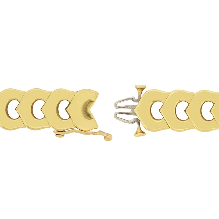 Classically Cartier, this bracelet wraps your wrist in 18 carat gold “C” logos. The excellent craftsmanship is characteristic of the maison. The piece is signed and features a locking clasp that is easily fastened by the wearer. This lovely necklace would make a great gift!