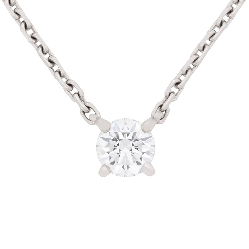 This classic necklace is a part of the ‘1895’ collection by Cartier. A 0.51 carat round brilliant cut diamond is the focus of the piece. It has been graded by GIA as an H in colour and a VVS1 in clarity. It shines in its white gold setting. The chain has the original Cartier makers marks on the clasp.
