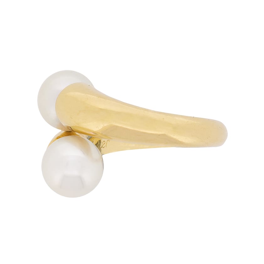 This unique ring is an original Cartier piece, dating back to 1996. The pearls are 9.2mm each in size and are set alongside 18 carat yellow gold.