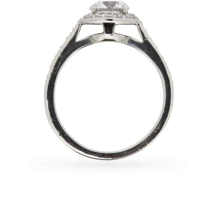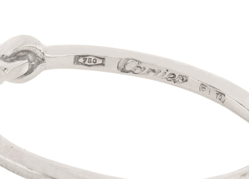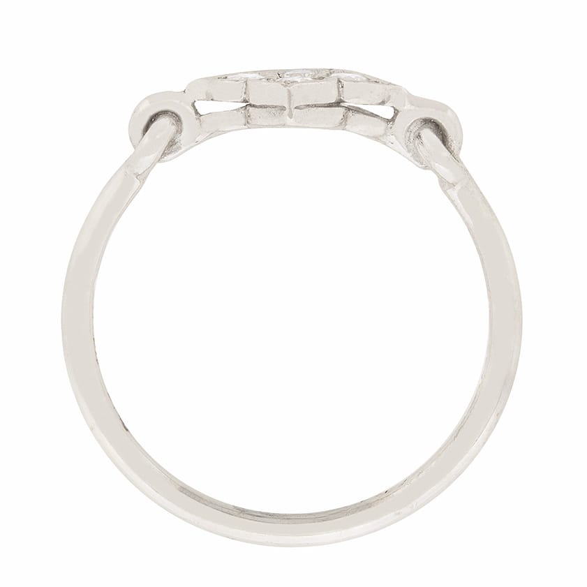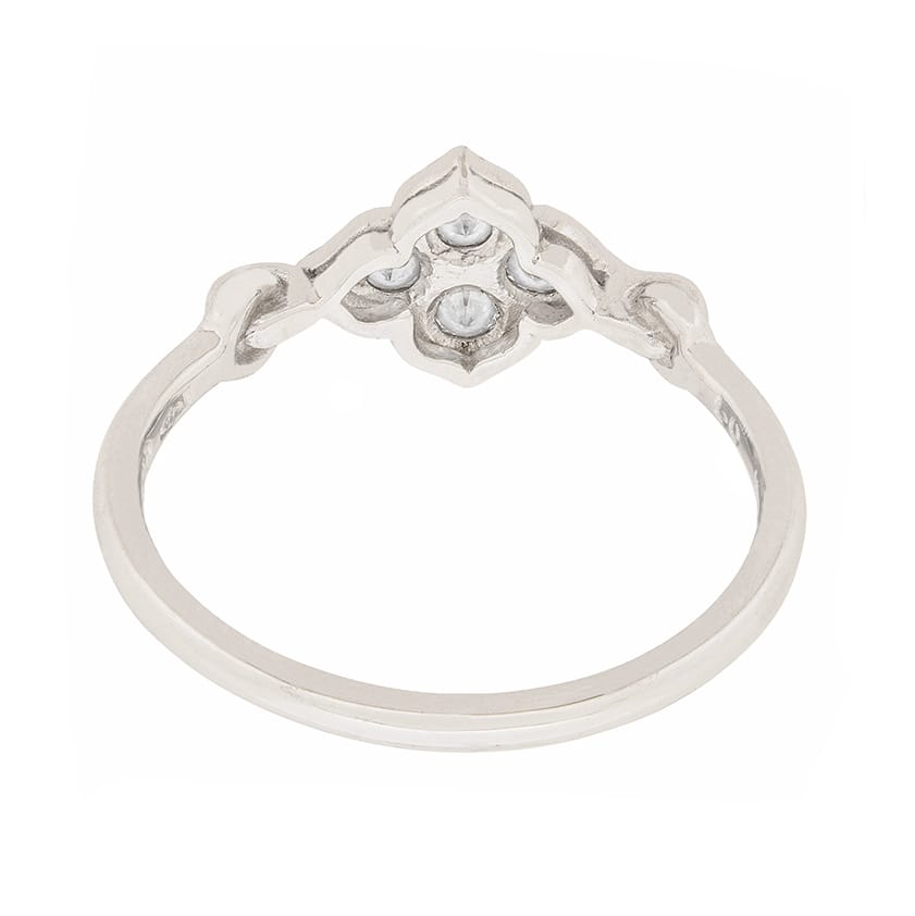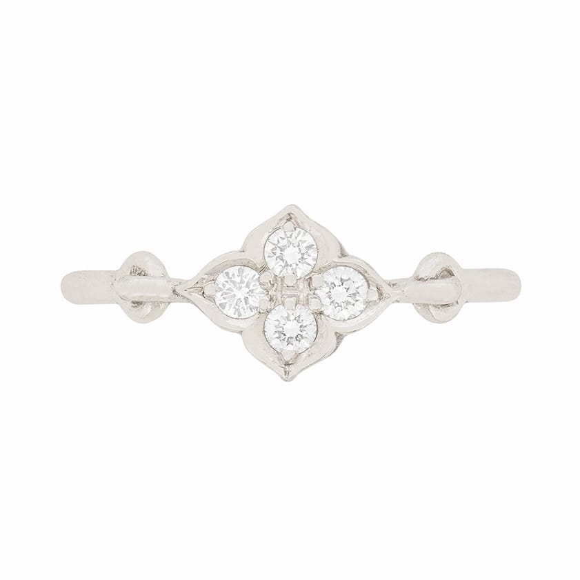 This Cartier diamond ring features four diamonds arranged in a petite foliate motif. The diamonds have a combined weight of 0.16 carat and are estimated as F in colour and VS in clarity. The setting is made of 18 carat white gold. It is authentic and signed ‘Cartier’ with the appropriate makers marks. This lovely ring would make a great gift!