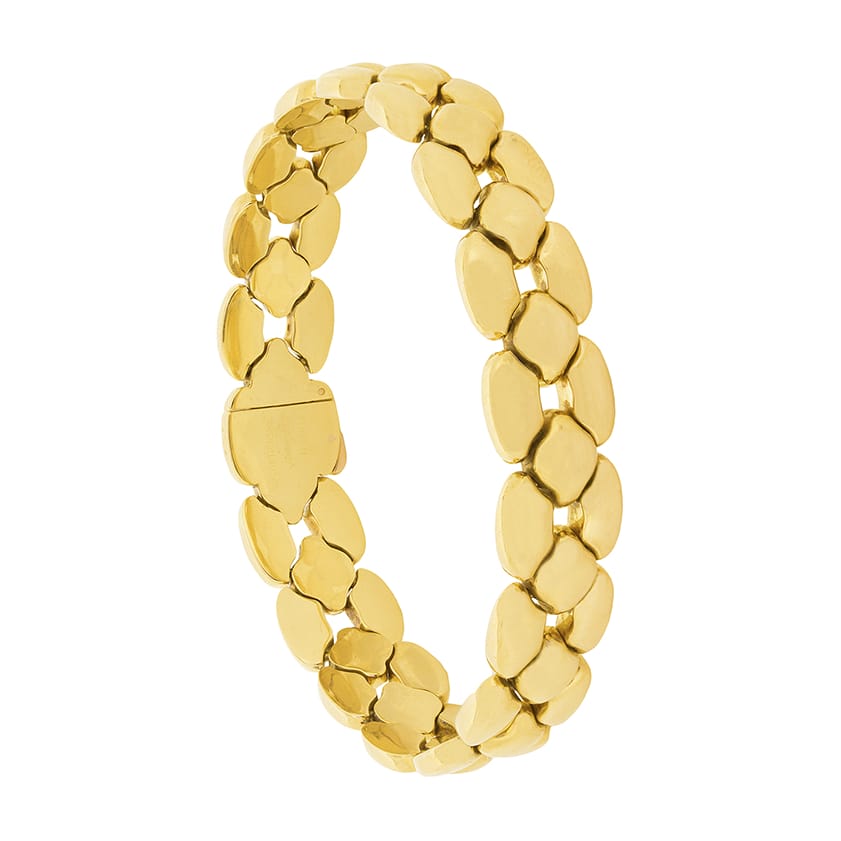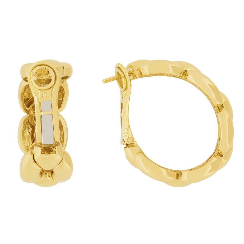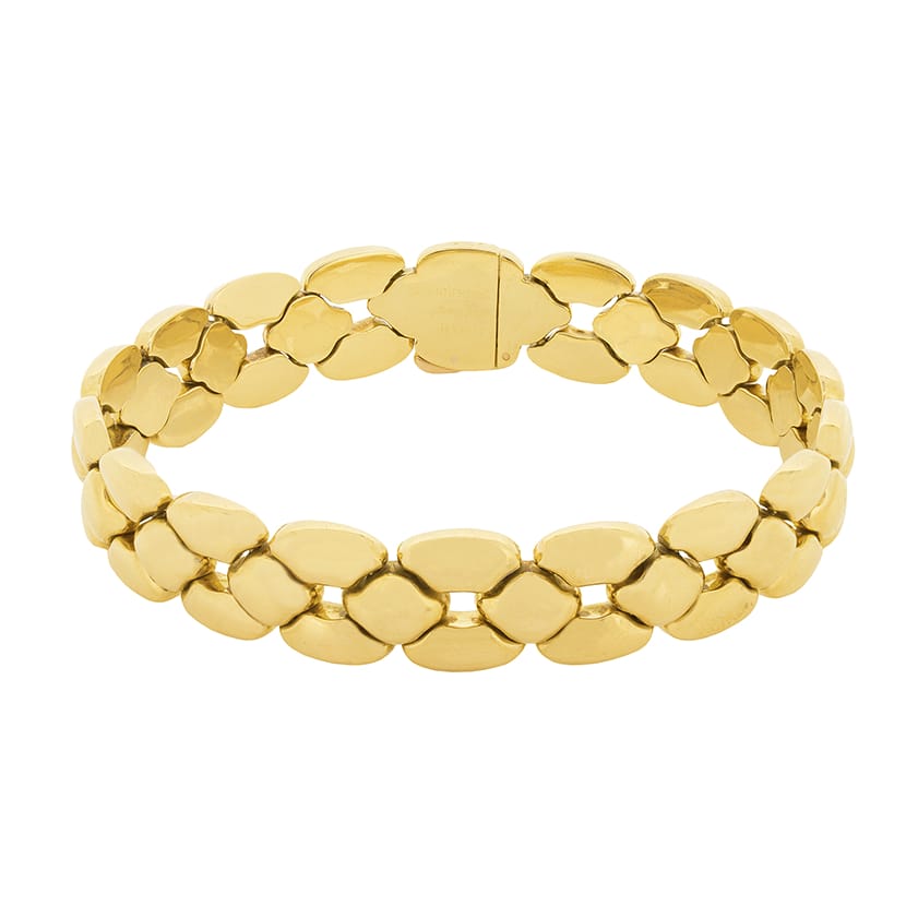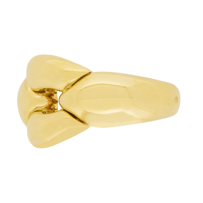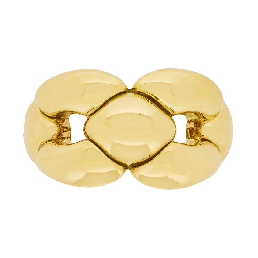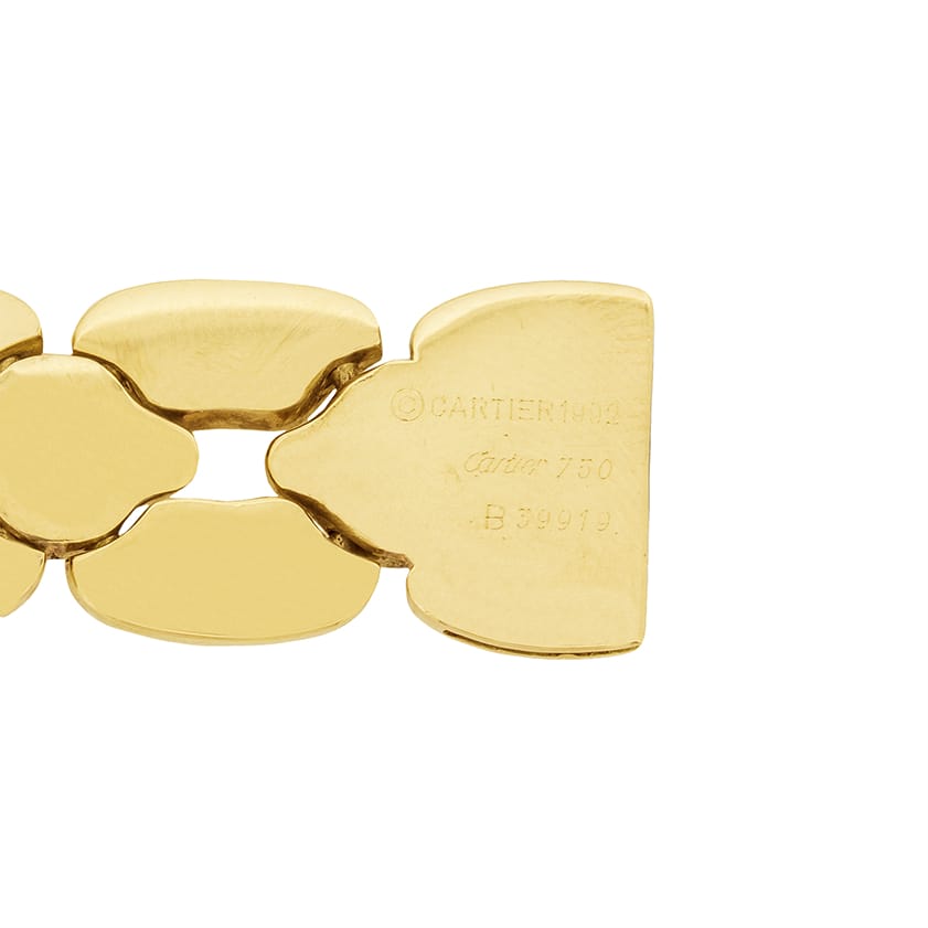 This beautiful Cartier set is the ‘Margot’ collection. Rare to find as a full set, this collection has all four pieces. The necklace weighs 91.3 grams, is 42 cm in length and is 18 carat yellow gold with a push clasp and safety clasp. The bracelet weighs 44.3 grams of 18 carat yellow gold and is 20 cm in length. It shares the clasps of the necklace. The earrings have a combined weight of 25.9 grams of 18 carat and are for pierced ears, with a hinge clasp. The final piece, the ring, is a size K, weighs 10 grams and is also in 18 carat yellow gold. All the elements of the set have the Cartier makers mark and the pieces are hallmarked and confirmed as gold.