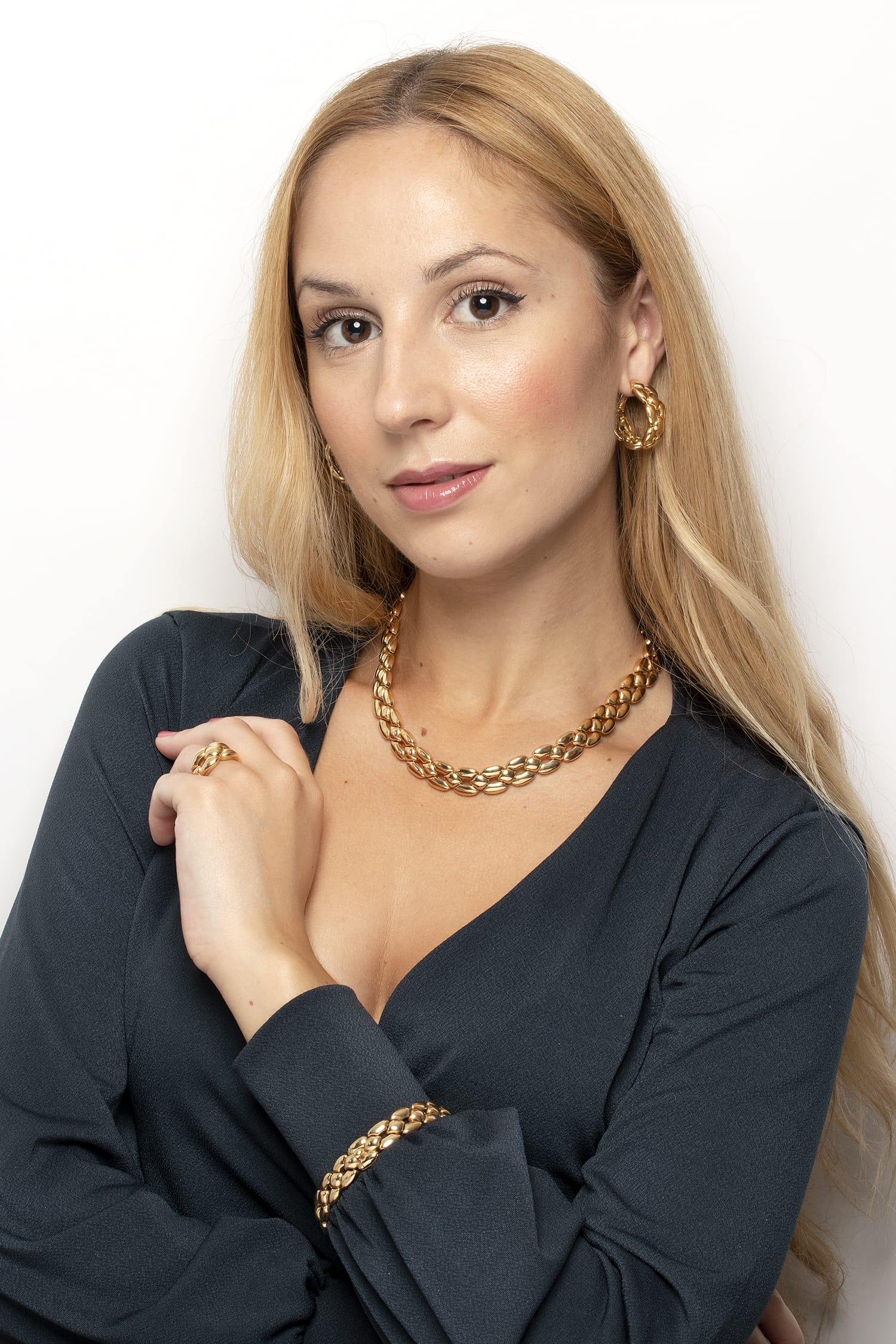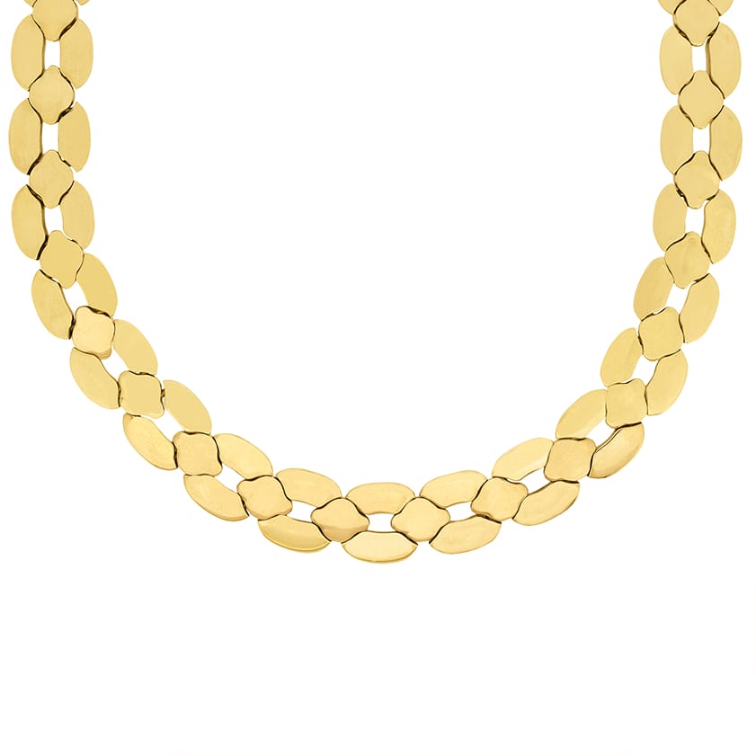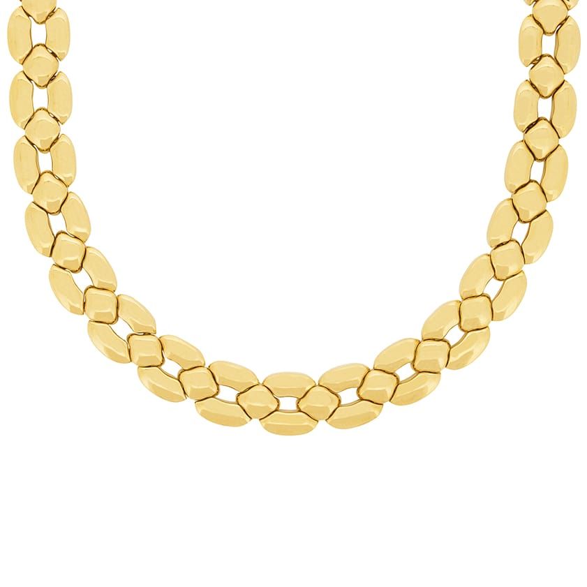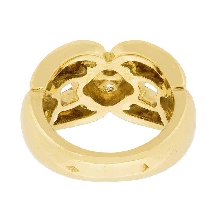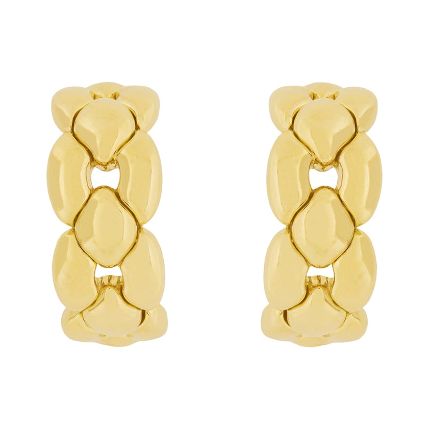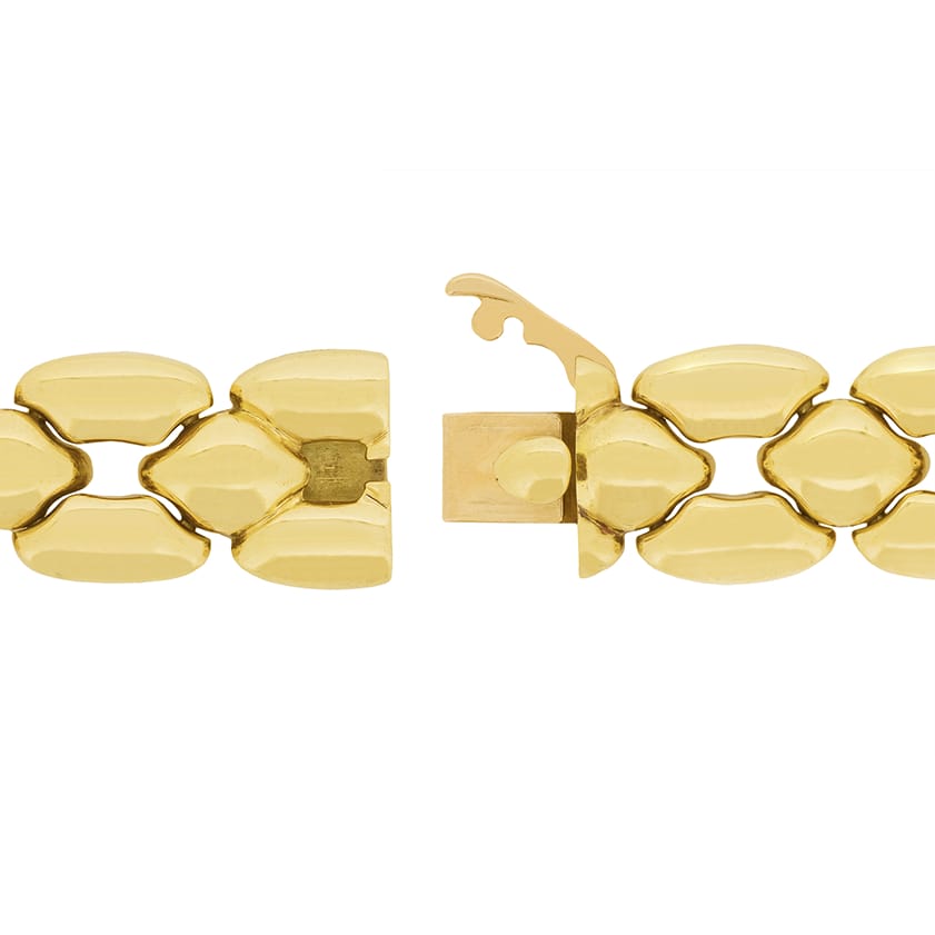 This beautiful Cartier set is the ‘Margot’ collection. Rare to find as a full set, this collection has all four pieces. The necklace weighs 91.3 grams, is 42 cm in length and is 18 carat yellow gold with a push clasp and safety clasp. The bracelet weighs 44.3 grams of 18 carat yellow gold and is 20 cm in length. It shares the clasps of the necklace. The earrings have a combined weight of 25.9 grams of 18 carat and are for pierced ears, with a hinge clasp. The final piece, the ring, is a size K, weighs 10 grams and is also in 18 carat yellow gold. All the elements of the set have the Cartier makers mark and the pieces are hallmarked and confirmed as gold.