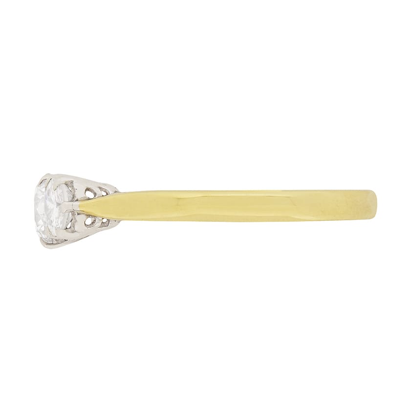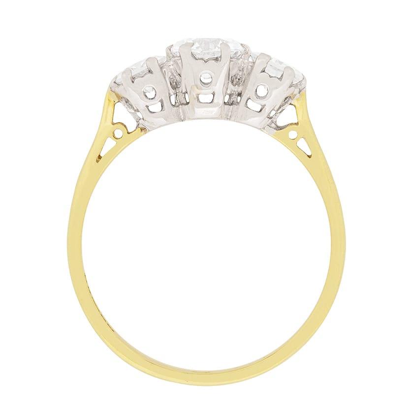 A trio of round brilliant cut diamonds have been claw set in 18 carat white gold collets at the heart of this classic three stone diamond engagement ring. The diamonds, which are beautifully-balanced with the largest of the three stones at the ring’s centre, total 1.00 carat. They are G in colour and SI in clarity. The balance of the ring, which is hallmarked ‘1994’ and features traditional chenier-supported shoulders, is comprised of 18 carat yellow gold.