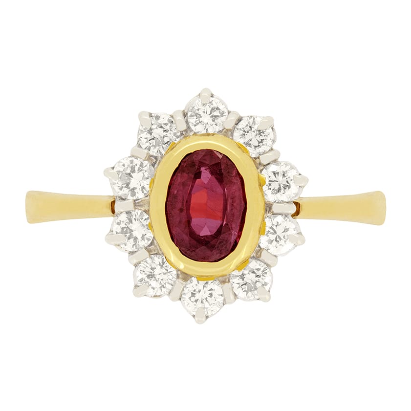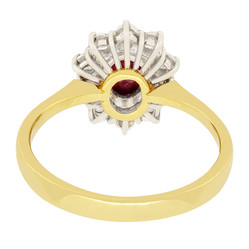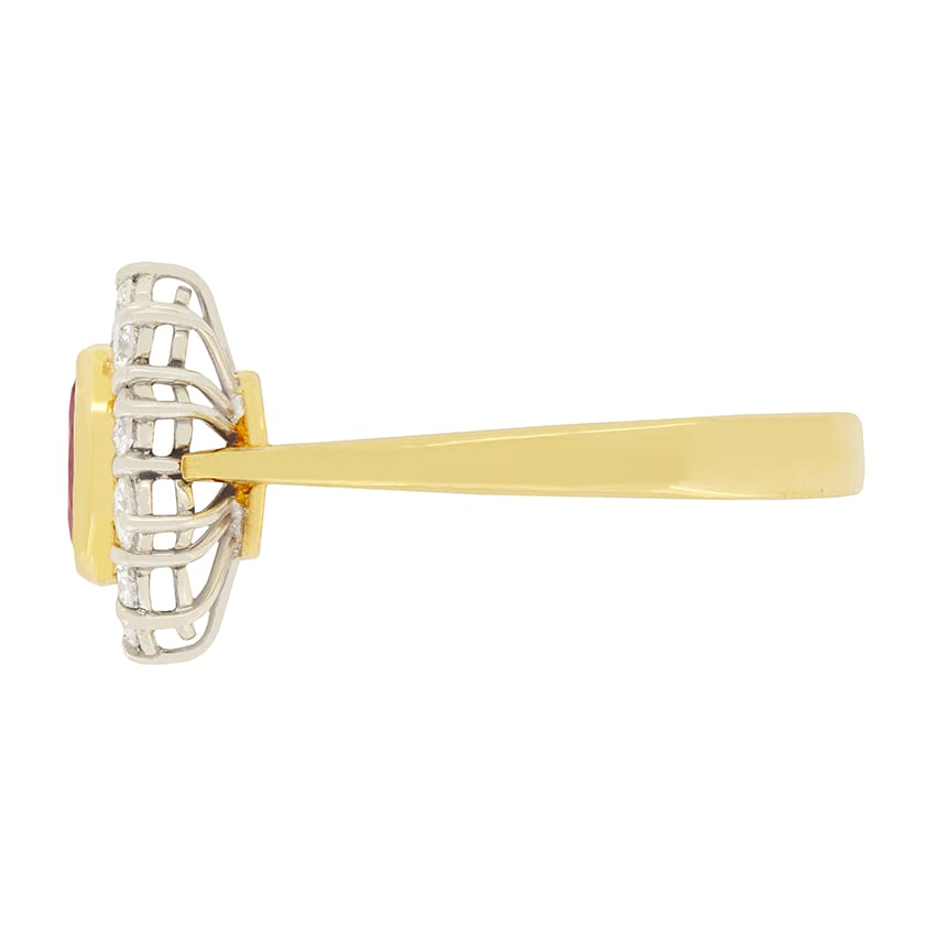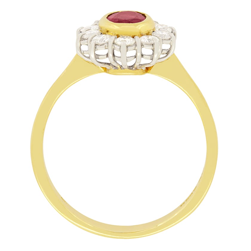 Set in the centre of this ring is a beautiful 0.65 carat red ruby. It has been rub over set and surrounded by a halo of round brilliant cut diamonds. The diamonds total to 0.50 carat and are F in colour and VS2 in clarity. The ruby has been set in 18ct yellow gold along with the band whilst the diamonds have been set in 18ct white gold to help show them off.