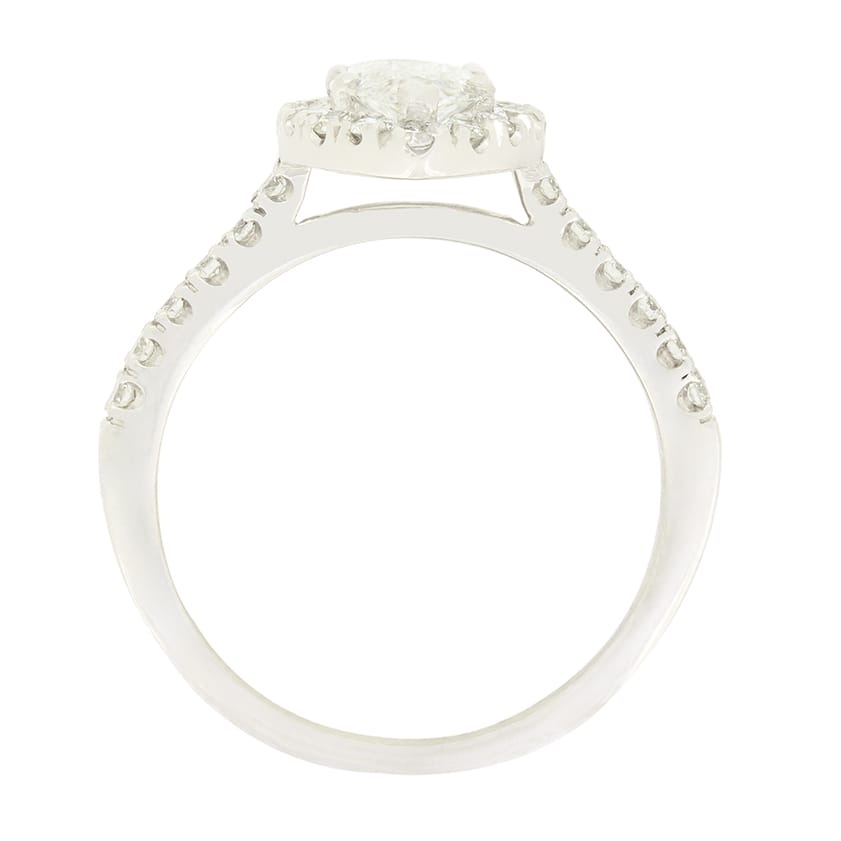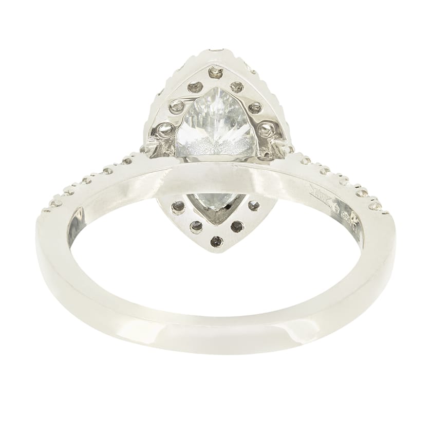 This stunning contemporary piece centres around a sparkling marquise cut diamond. The diamond is 0.86 carat, with a colour of E and clarity of SI2 and comes fully GIA certified. Surrounding, a halo of round brilliant diamonds are set, extending down each shoulder, totalling 0.28 carat and matching the centre for quality. The ring itself is made in platinum for a brilliant white look.