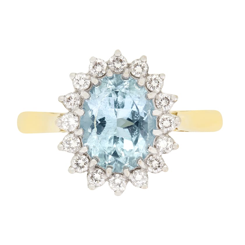 This striking contemporary halo ring features a captivating 1.60 carat oval cut aquamarine at it’s heart. The centre stone is elegantly claw set into 18 carat white gold and surrounded by a halo of 16 round brilliant cut diamonds. These diamonds, with a total weight of 0.32 carats, are of high quality, F in colour and VS in clarity. The 18 carat white gold head rests atop a basket and band of beautifully contrasting 18 carat yellow gold completing the design.