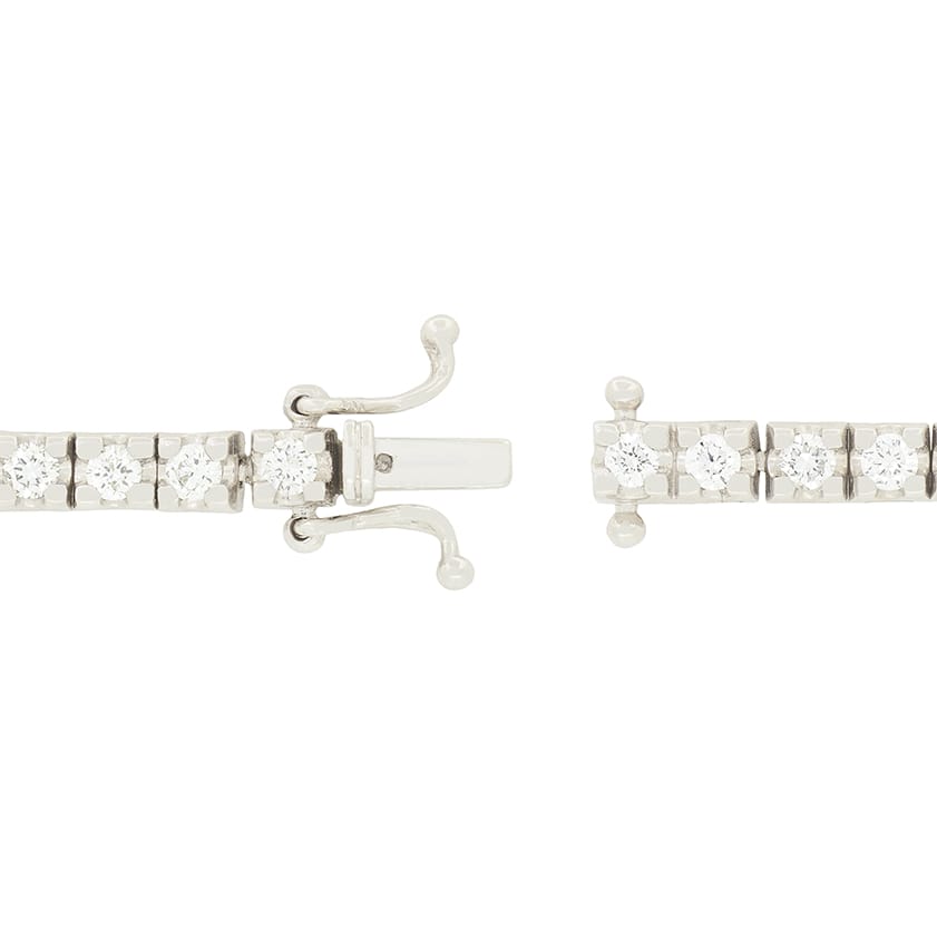 Fifty three sparkling diamonds wrap around the wearer’s wrist in this stunning tennis bracelet. The round brilliant cut diamonds weigh a total of 2.65 carat with matching colour of G and clarity of VS1 to VS2. Each stone sits within a box setting crafted from 18 carat white gold. This wonderful bracelet is 19cm long and drapes beautifully across the wearers wrist.