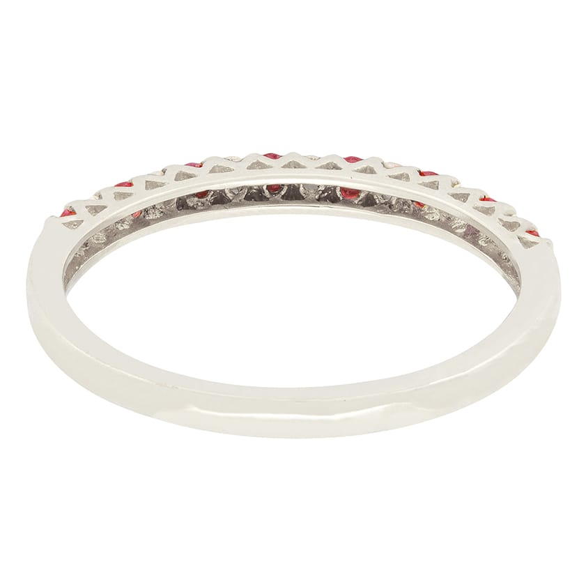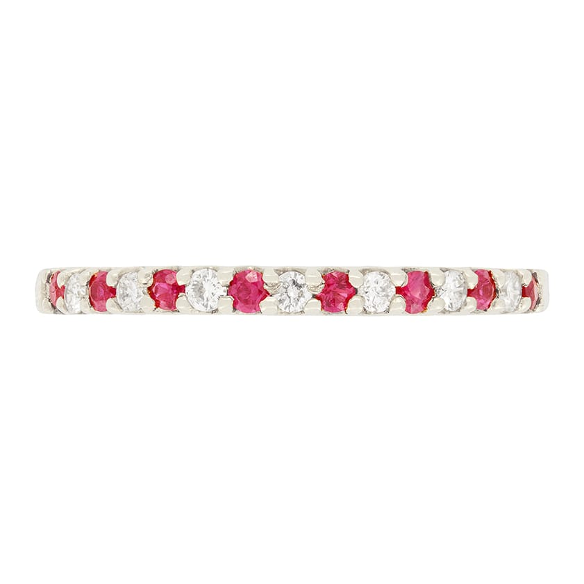 A classy half eternity band with alternating pink sapphires and diamonds. There are eight pink sapphires estimated at 0.16 carat total and seven diamonds estimated at 0.14 carat total. The diamonds have been graded as F/VS quality. All stones are claw set into a platinum band.