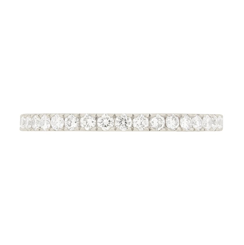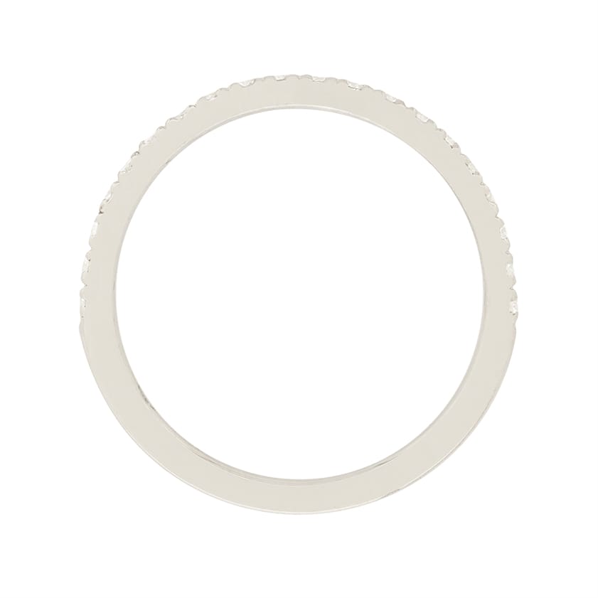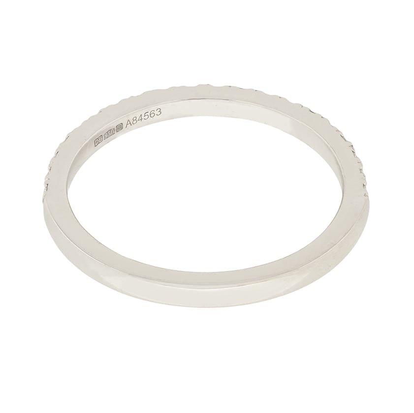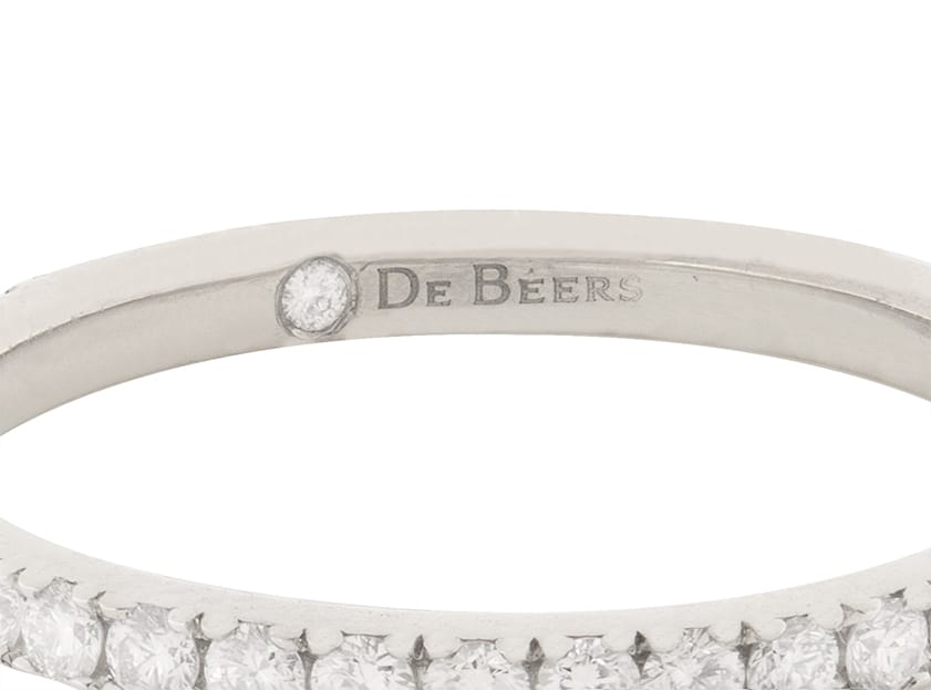 This DeBeers classic half eternity ring is micro set with 0.18 carat of diamonds. The diamonds are F colour and VS clarity. An additional diamond is set on the inside of the ring, giving that extra touch of detail. The diamonds are set in platinum.