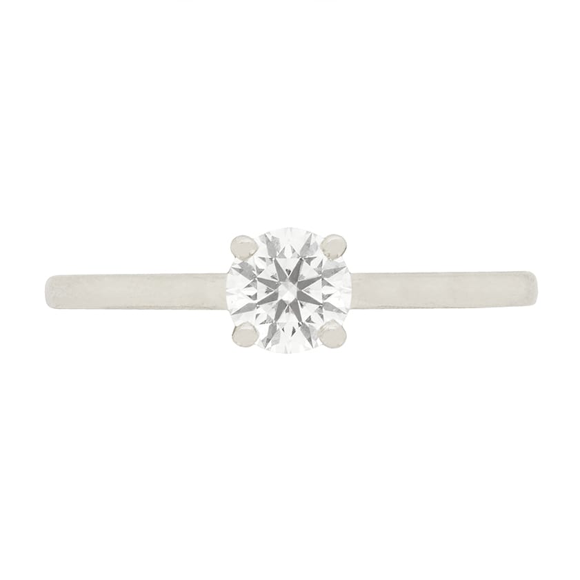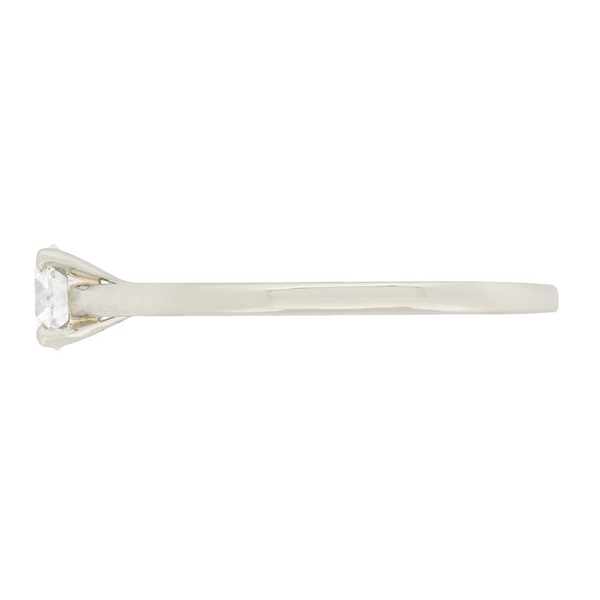 A classic diamond solitaire ring by DeBeers. The 0.43 carat diamond shines within four platinum claws. The band is also made of platinum, and retains all original DeBeers markings.