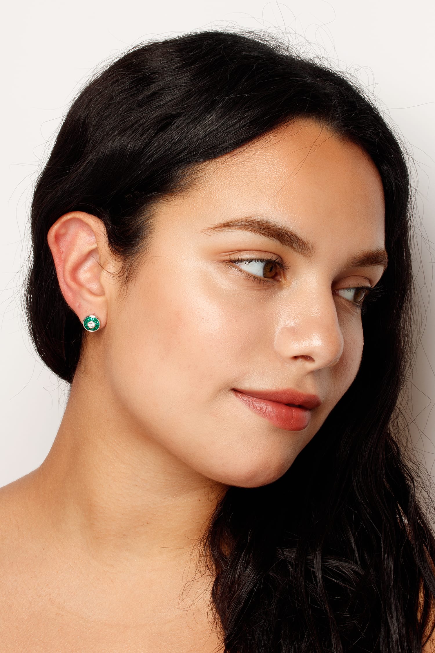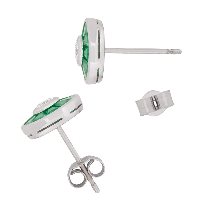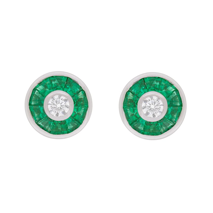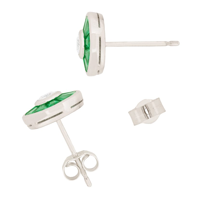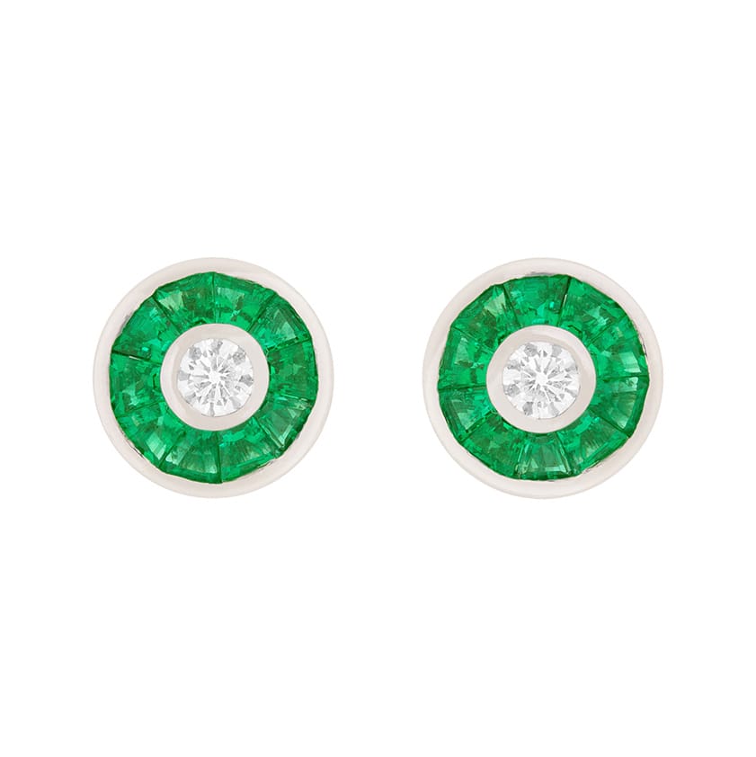 These vintage style earrings have a central diamond weighing 0.20 carat are surrounded by a halo of forest green emeralds. The round brilliant diamonds are rub over set and are F colour, VS clarity. The emeralds total 0.50 carat on each earring. All the stones are set within platinum, while the posts and butterfly backs are made from 18 carat white gold.
