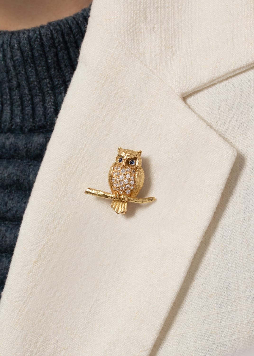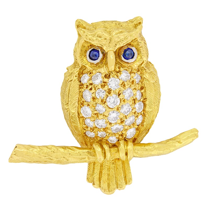 This whimsical Brooch takes on the likeness of an owl perched on a branch. The piece is crafted entirely from 18 carat yellow gold with the breast of the owl adorned with twenty four glistening round brilliant diamonds for a total of 0.25 carat. These diamonds all match in quality at F in colour and VS in clarity. A pair of 0.02 carat sapphires take on the role of the owls eyes adding to the realism of the design. This wonderful brooch has been hallmarked to notify it was created in London in 1996.