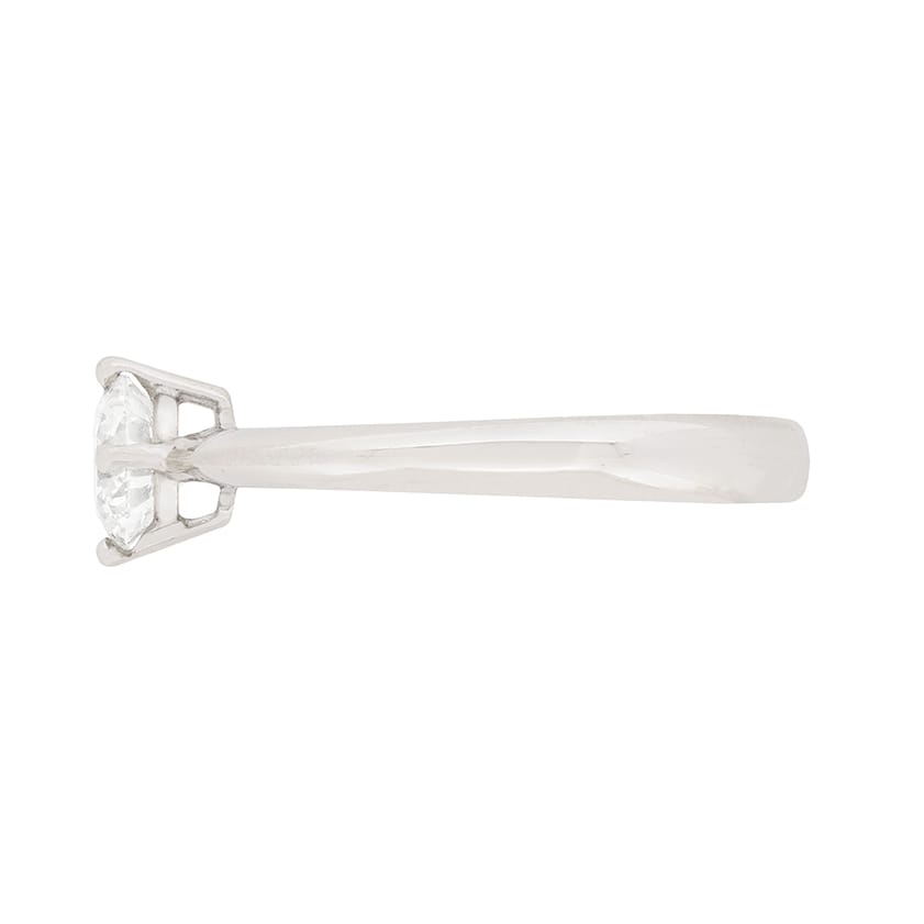 This classic diamond solitaire engagement ring centres a gorgeous EDR certified round brilliant cut diamond. It is 0.64 carat, VS2 clarity and H colour, and is set in a traditional four claw mounting. Slightly tapered shoulders lead to a polished shank, made completely in 18 carat white gold. This traditional diamond engagement ring in one of the most popular styles of all time.