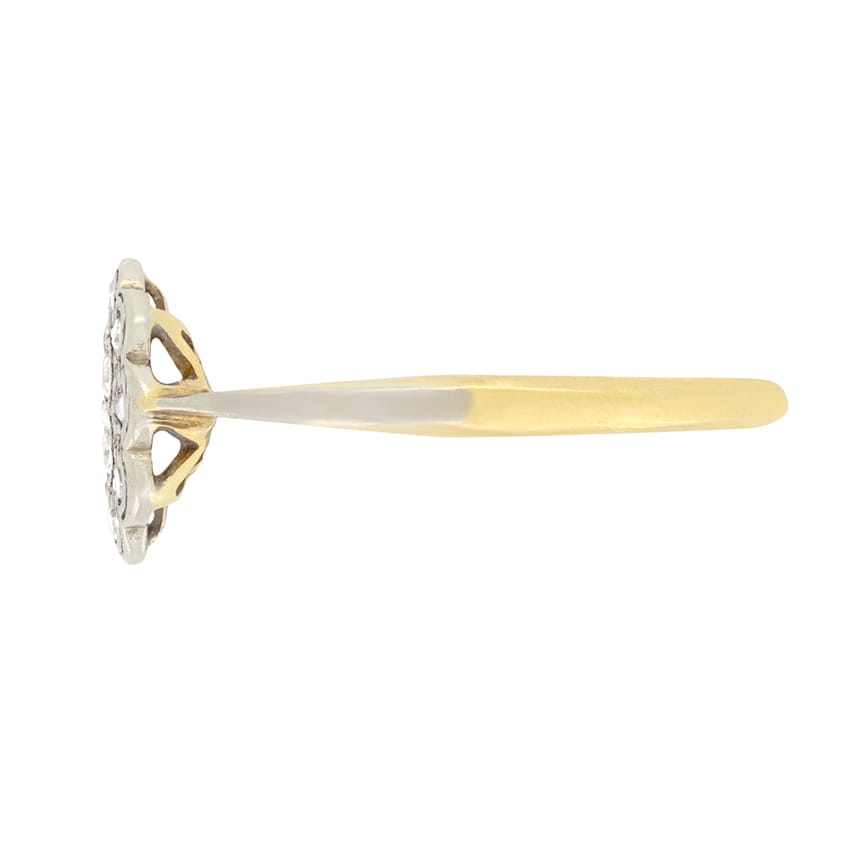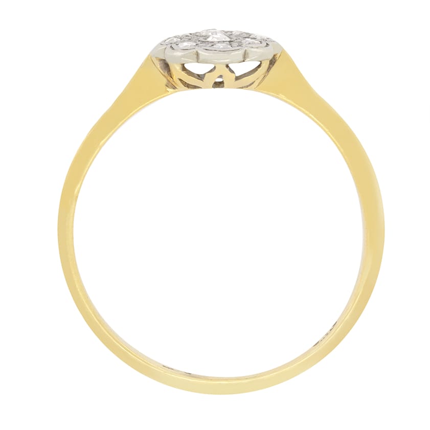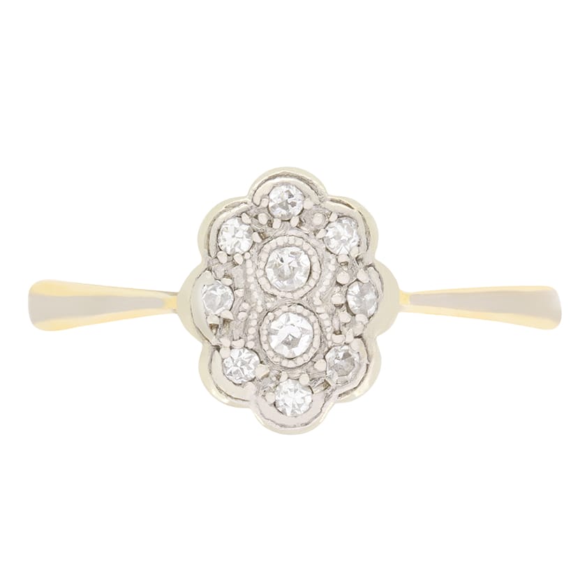 This sweet diamond cluster ring was hand crafted in the Edwardian period. The central old cut diamonds of 0.03 carat are surrounded by a further 8 stones of 0.01 carat each. Every diamond matches in quality with a colour of F and a clarity of VS. Set into a platinum head with milgrain detailing the diamonds shimmer wonderfully. Shoulders of platinum flow down to a band of 18 carat yellow gold, the same metal as the basketwork.