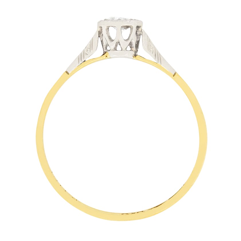 This sweet Edwardian engagement ring features a 0.25 carat old cut diamond. The hand cut diamond is a G colour and VS2 clarity. It is held within a platinum illusion style setting, making the diamond appear larger. There is lovely detailing on the platinum shoulders, while the band is made of smooth 18 carat yellow gold. This engagement ring would have been made entirely by hand in the 1910s.
